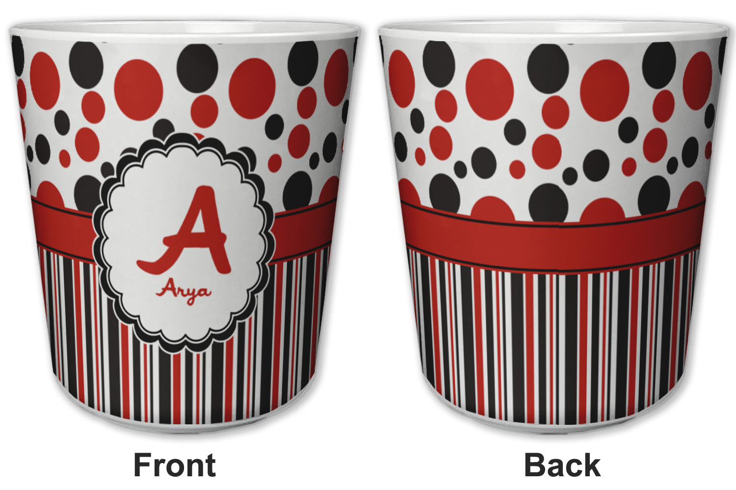 Made from a durable plastic, these tumbler cups are strong enough to withstand daily use and are perfect for young children. Each of these personalized plastic cups holds 6 ounces and measure at approximately 3" x 3" x 3.25". Place them in the bathroom as a rinsing cup, or give them to your kids during mealtimes. These 6 oz. plastic cups are BPA free, microwave and dishwasher safe, for your convenience. Your personalized design is displayed across the entire outside of this cup, while the inside is white in color to make your customization really stand out.