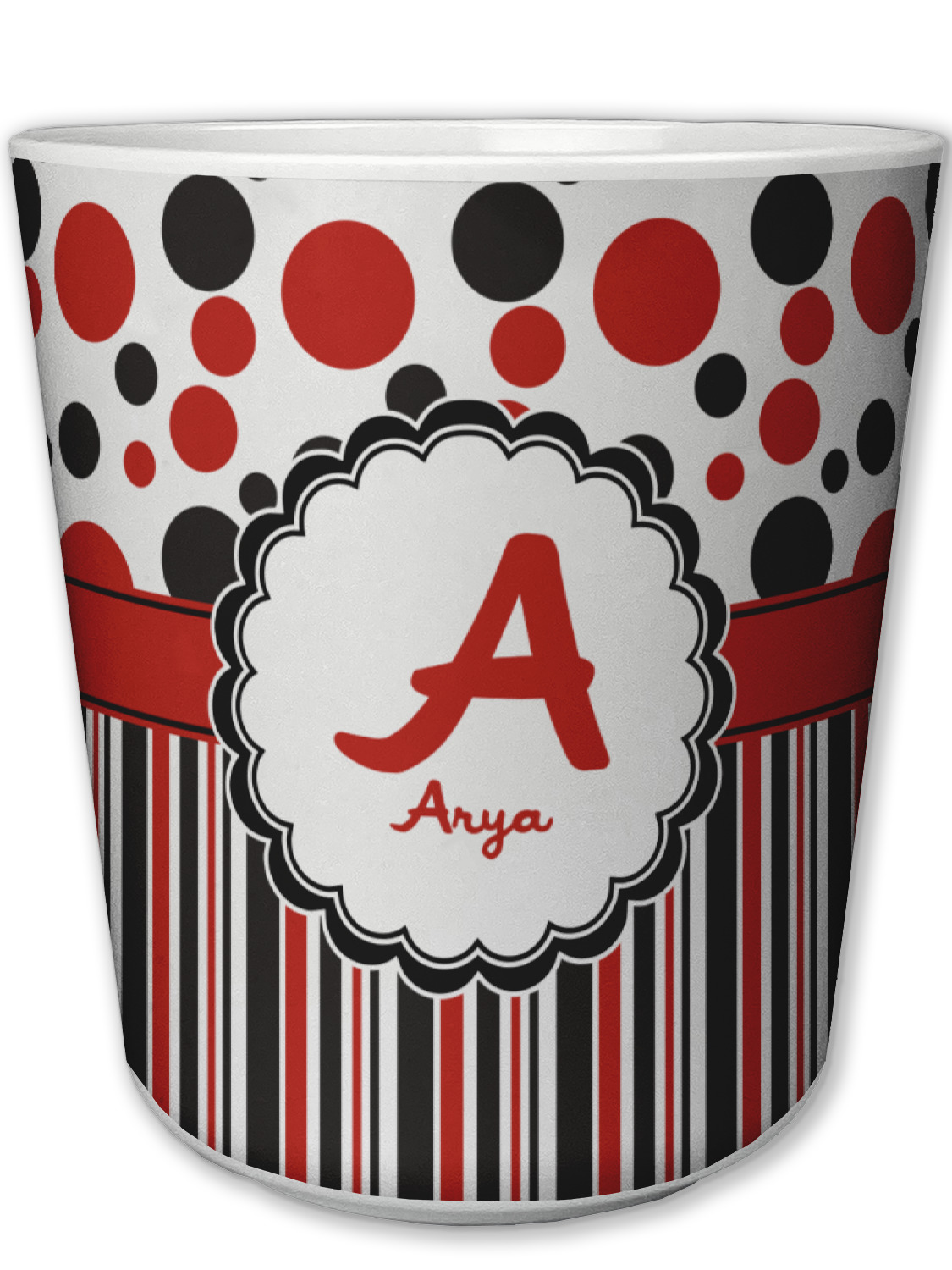 The classic red, black, and white color scheme has been revived with a touch of fun. The top part of this design if filled with different shaped polka dots in black and red that pop on a white background. The bottom half of the design has coordinating colored stripes that complete this fun look.