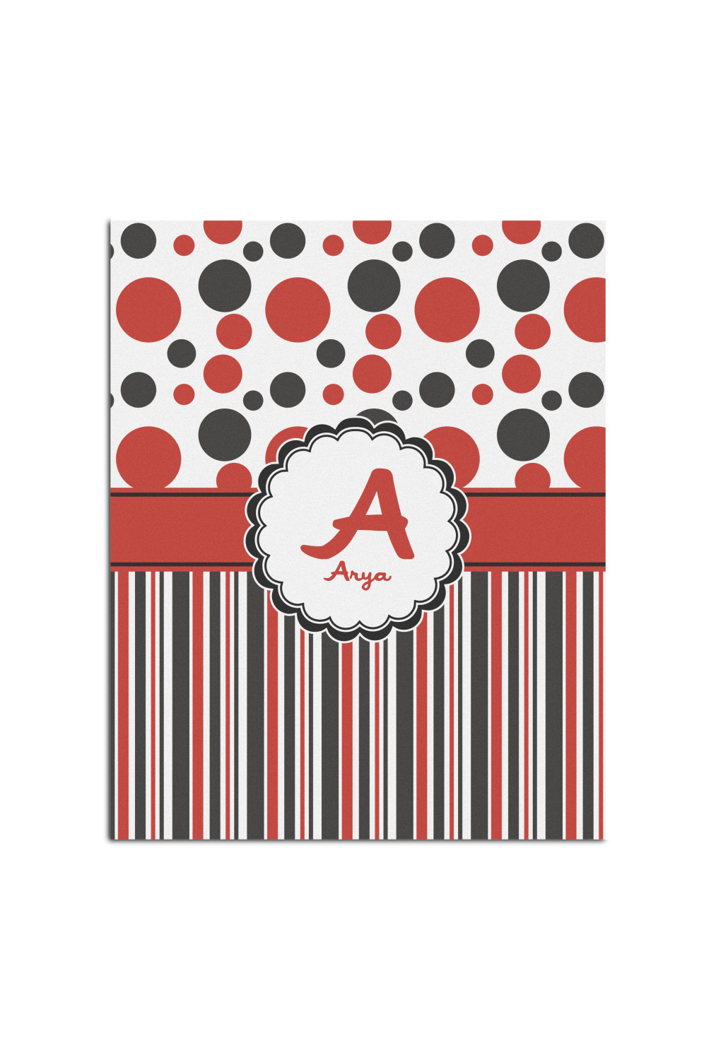 The classic red, black, and white color scheme has been revived with a touch of fun. The top part of this design if filled with different shaped polka dots in black and red that pop on a white background. The bottom half of the design has coordinating colored stripes that complete this fun look.