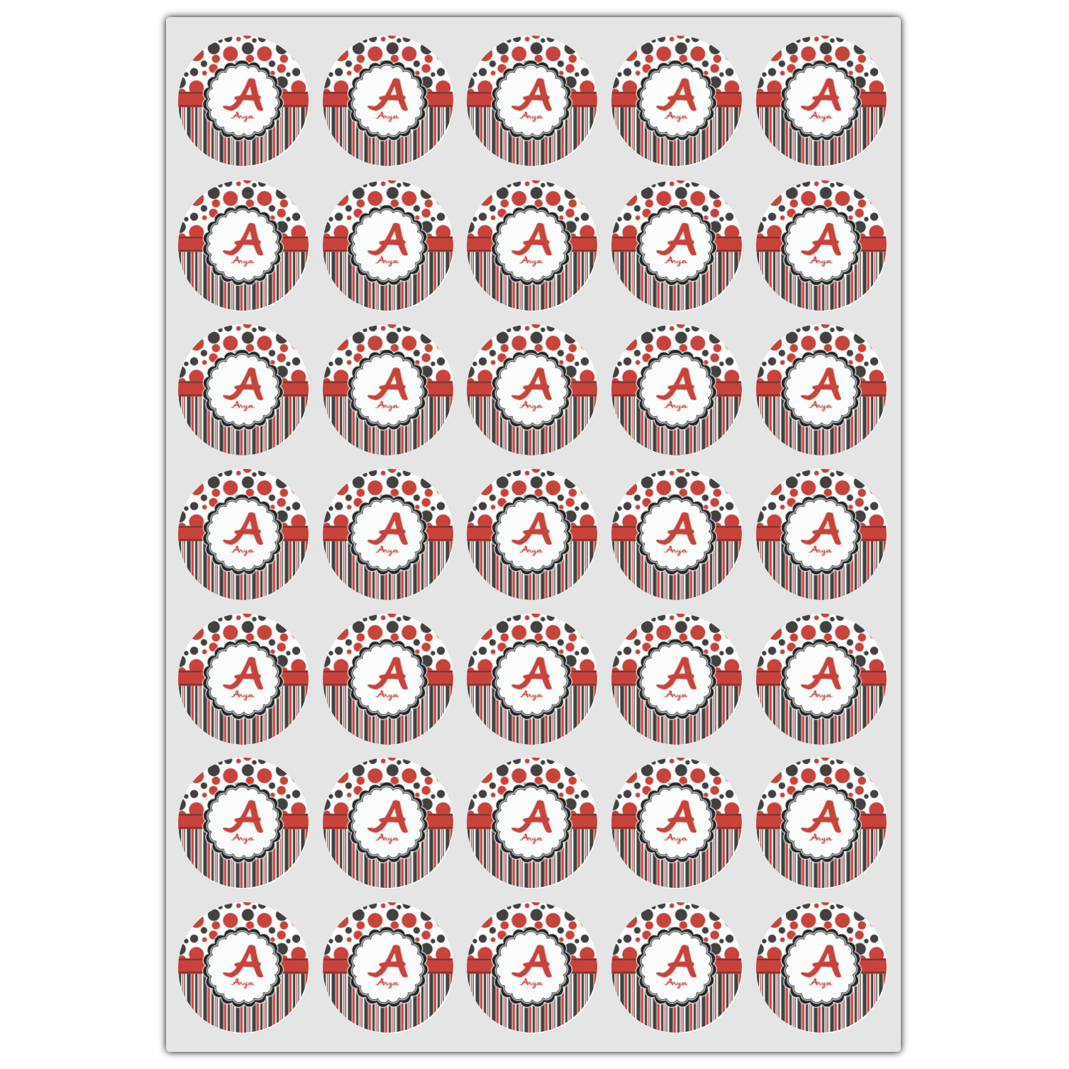 A wide red band with an inset of black trim add the perfect backdrop for the white scalloped circle label that is edged with double rows of black. This label provides the perfect area for personalization of your choice.