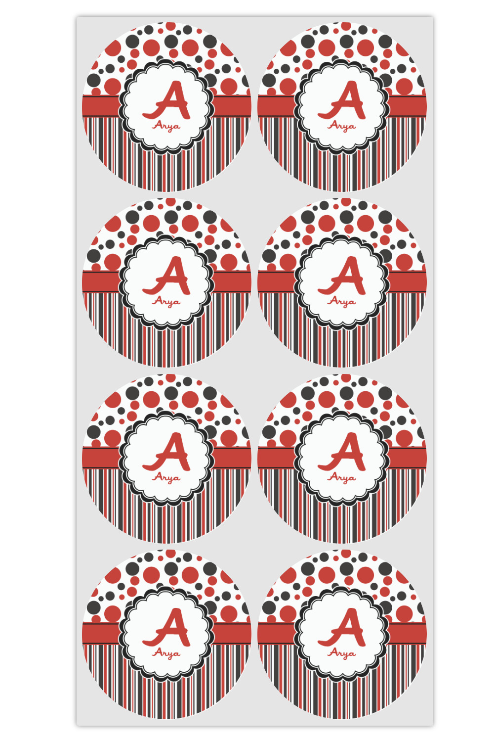 A wide red band with an inset of black trim add the perfect backdrop for the white scalloped circle label that is edged with double rows of black. This label provides the perfect area for personalization of your choice.