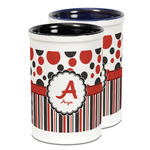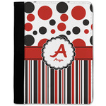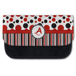 The classic red, black, and white color scheme has been revived with a touch of fun. The top part of this design if filled with different shaped polka dots in black and red that pop on a white background. The bottom half of the design has coordinating colored stripes that complete this fun look.