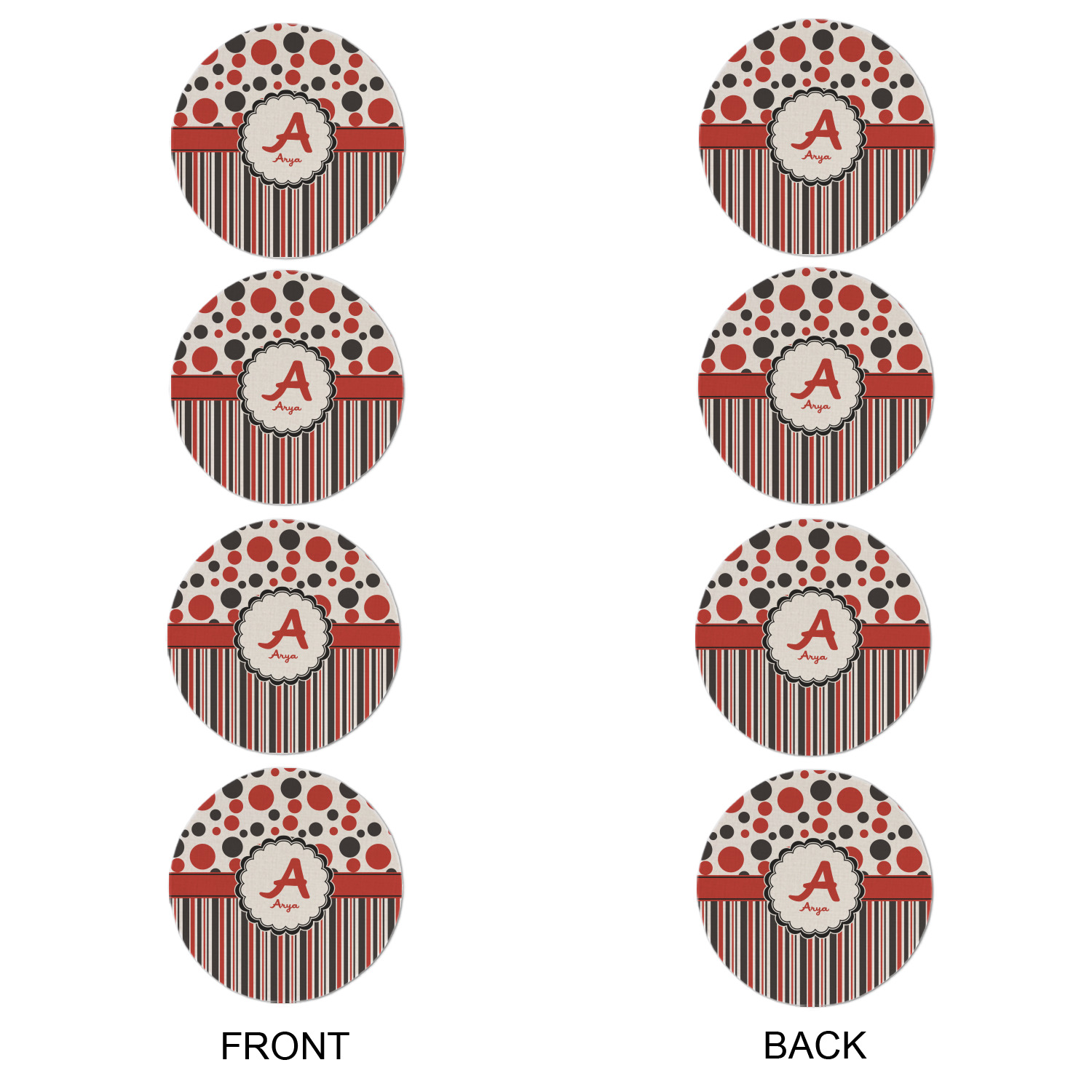 The classic red, black, and white color scheme has been revived with a touch of fun. The top part of this design if filled with different shaped polka dots in black and red that pop on a white background. The bottom half of the design has coordinating colored stripes that complete this fun look.