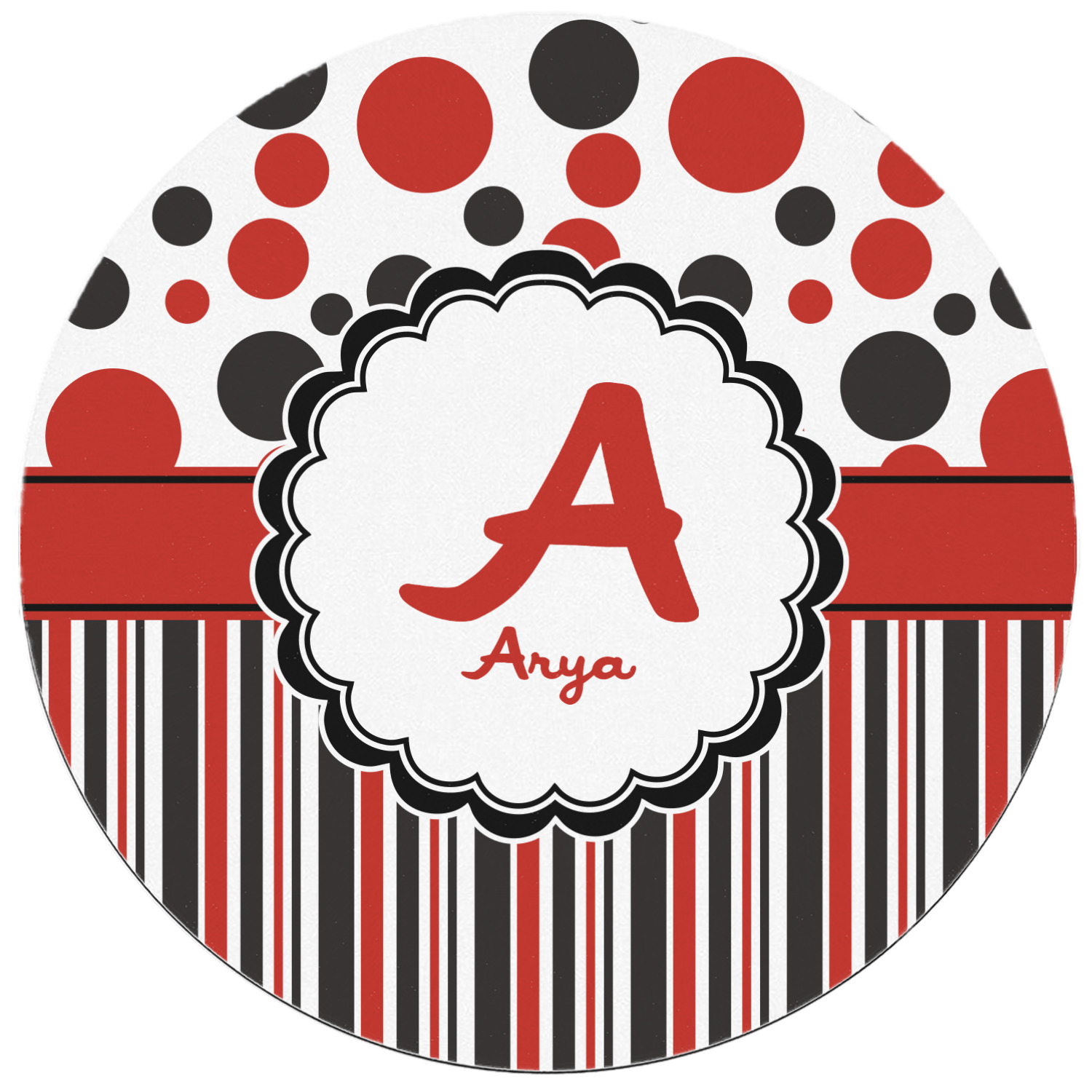 The classic red, black, and white color scheme has been revived with a touch of fun. The top part of this design if filled with different shaped polka dots in black and red that pop on a white background. The bottom half of the design has coordinating colored stripes that complete this fun look.