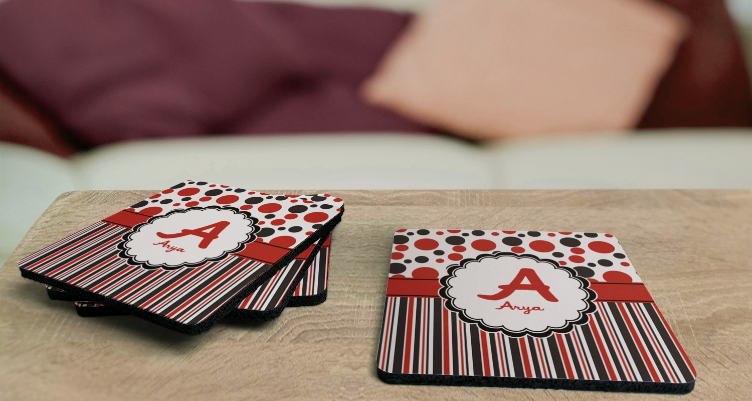 These drink coasters have a smooth, polyester top and a textured, rubber backing on its bottom. The non-slip rubber backing underneath works to keep any spills at bay. At 4 by 4 by 0.25 inches thick, these custom coasters are a suitable size for most drinkware. Your personalization is displayed atop the face of the cup coaster. We sell these rubber coasters in two different shapes: square and round. You can buy each shape as singulars or as a set of 4.