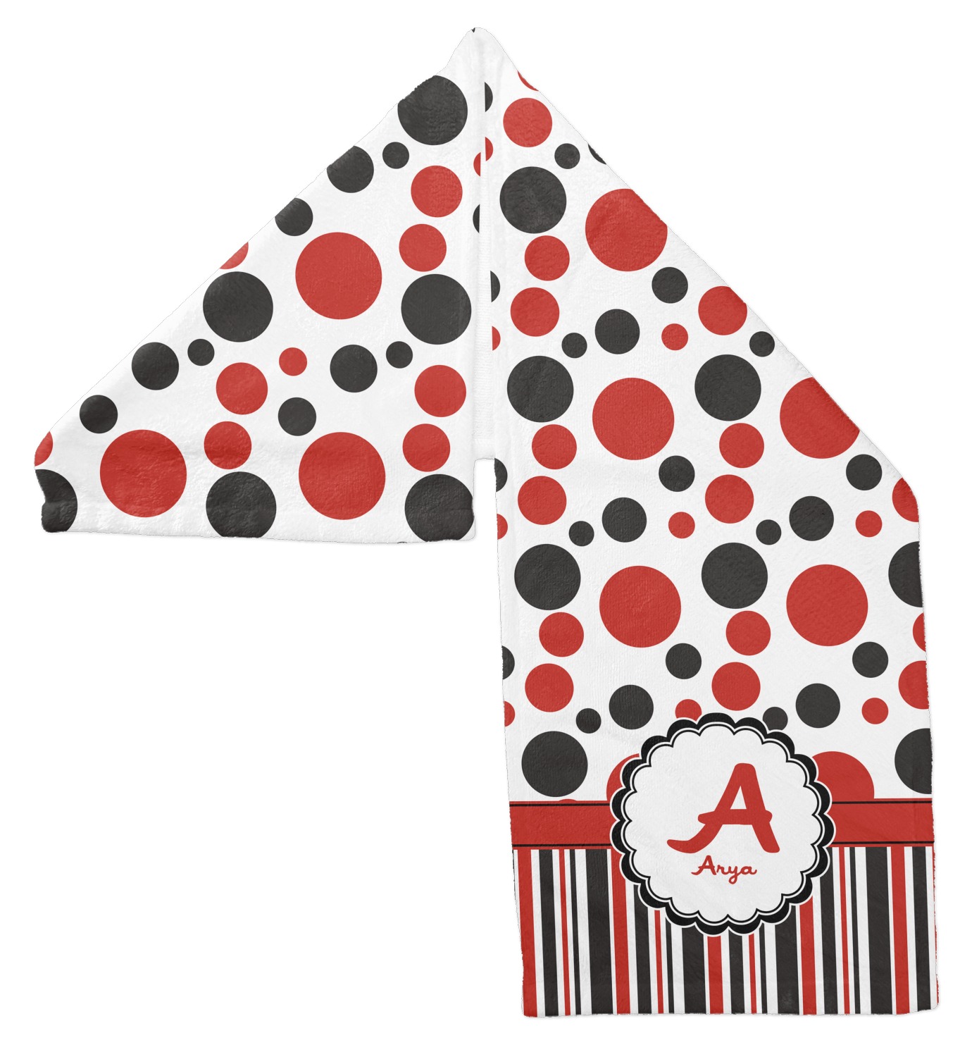 The classic red, black, and white color scheme has been revived with a touch of fun. The top part of this design if filled with different shaped polka dots in black and red that pop on a white background. The bottom half of the design has coordinating colored stripes that complete this fun look.