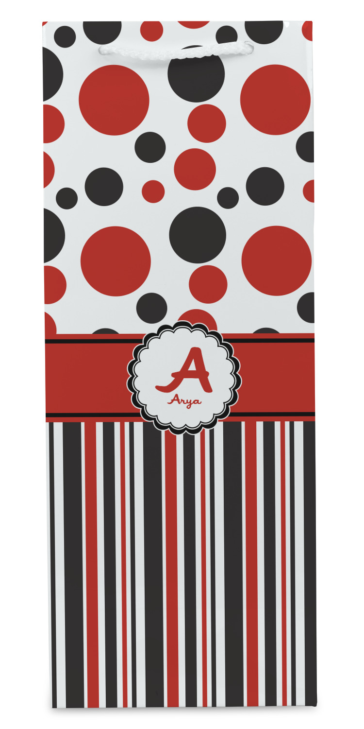 The classic red, black, and white color scheme has been revived with a touch of fun. The top part of this design if filled with different shaped polka dots in black and red that pop on a white background. The bottom half of the design has coordinating colored stripes that complete this fun look.