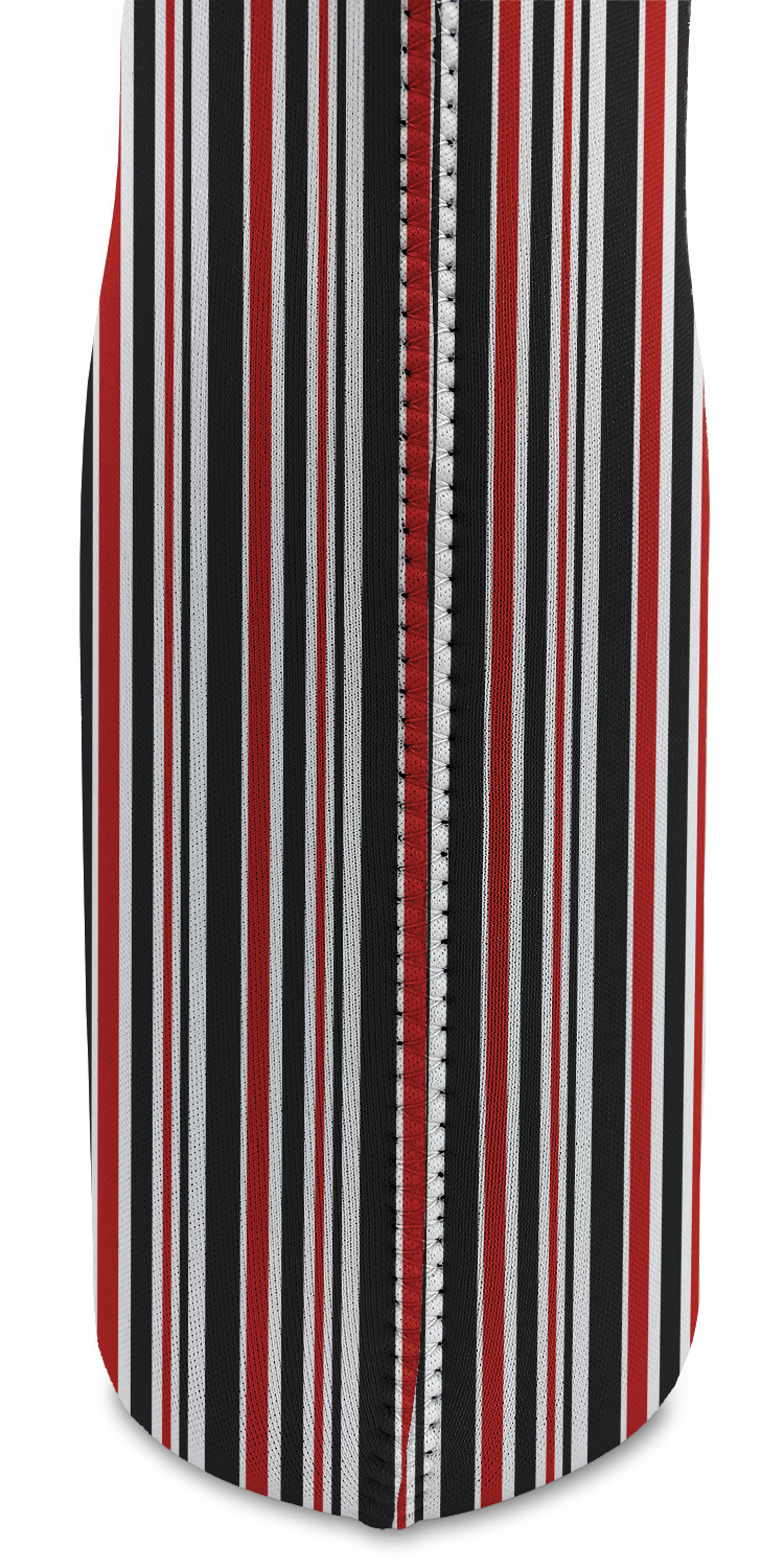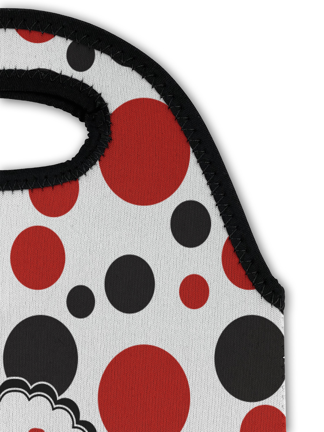 The classic red, black, and white color scheme has been revived with a touch of fun. The top part of this design if filled with different shaped polka dots in black and red that pop on a white background. The bottom half of the design has coordinating colored stripes that complete this fun look.