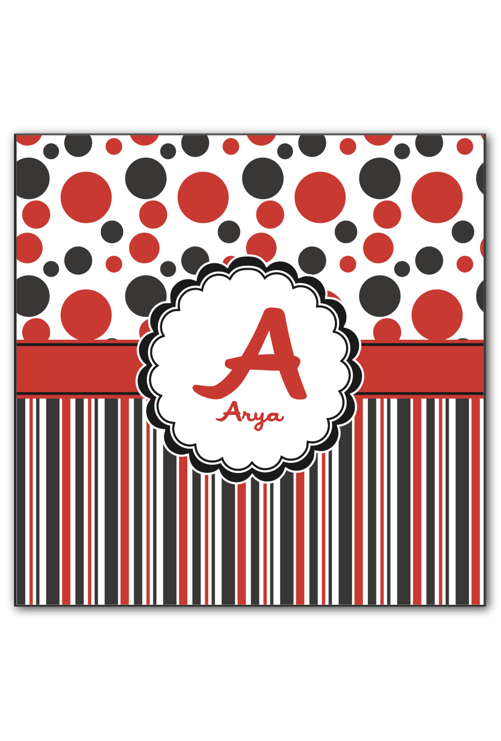 The classic red, black, and white color scheme has been revived with a touch of fun. The top part of this design if filled with different shaped polka dots in black and red that pop on a white background. The bottom half of the design has coordinating colored stripes that complete this fun look.