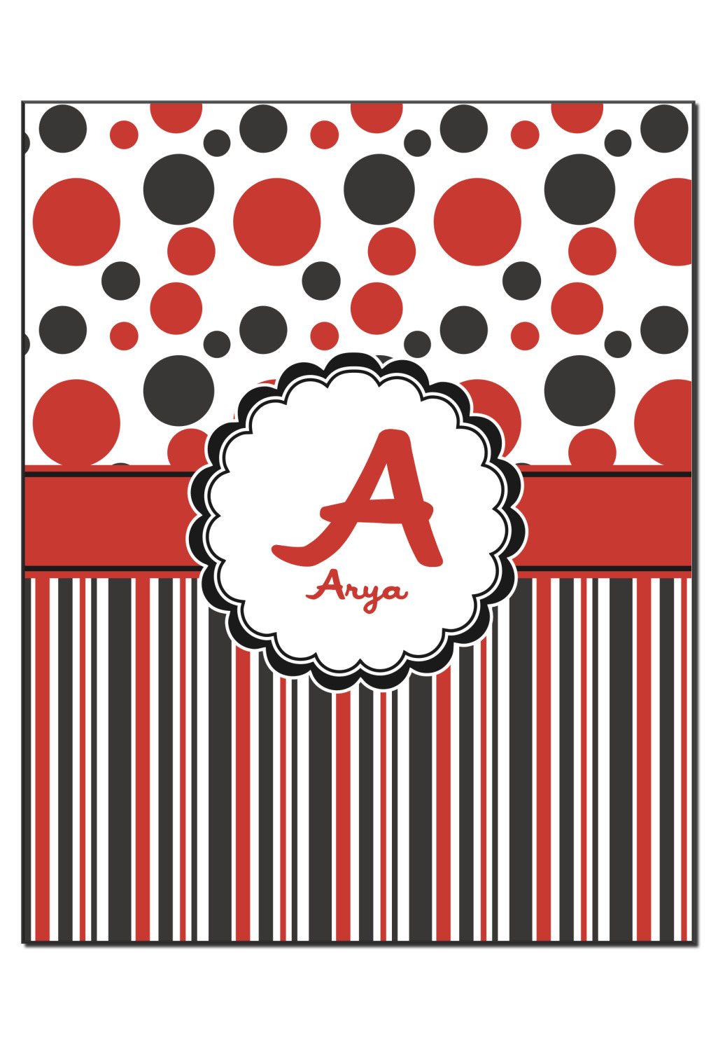 The classic red, black, and white color scheme has been revived with a touch of fun. The top part of this design if filled with different shaped polka dots in black and red that pop on a white background. The bottom half of the design has coordinating colored stripes that complete this fun look.