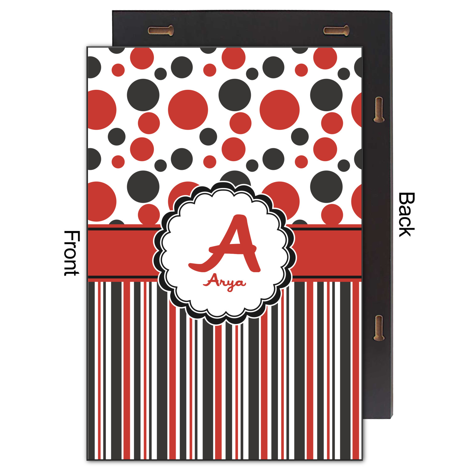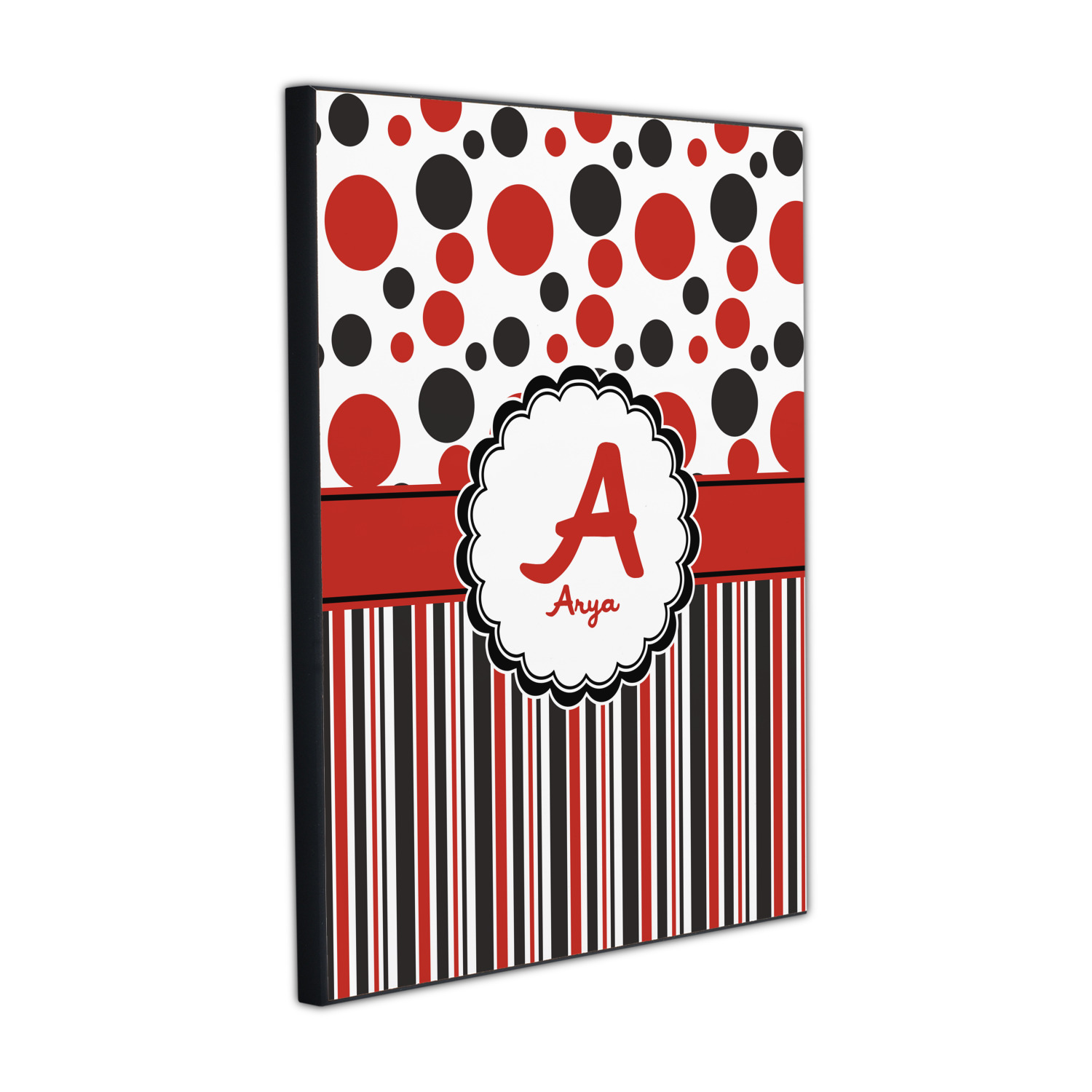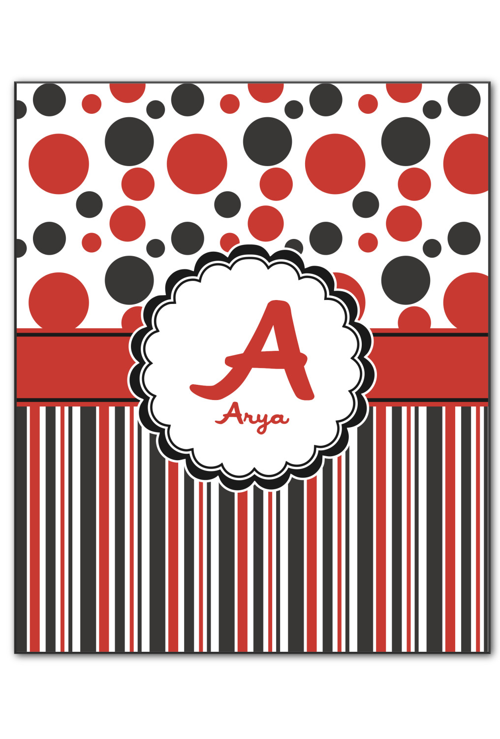 The classic red, black, and white color scheme has been revived with a touch of fun. The top part of this design if filled with different shaped polka dots in black and red that pop on a white background. The bottom half of the design has coordinating colored stripes that complete this fun look.