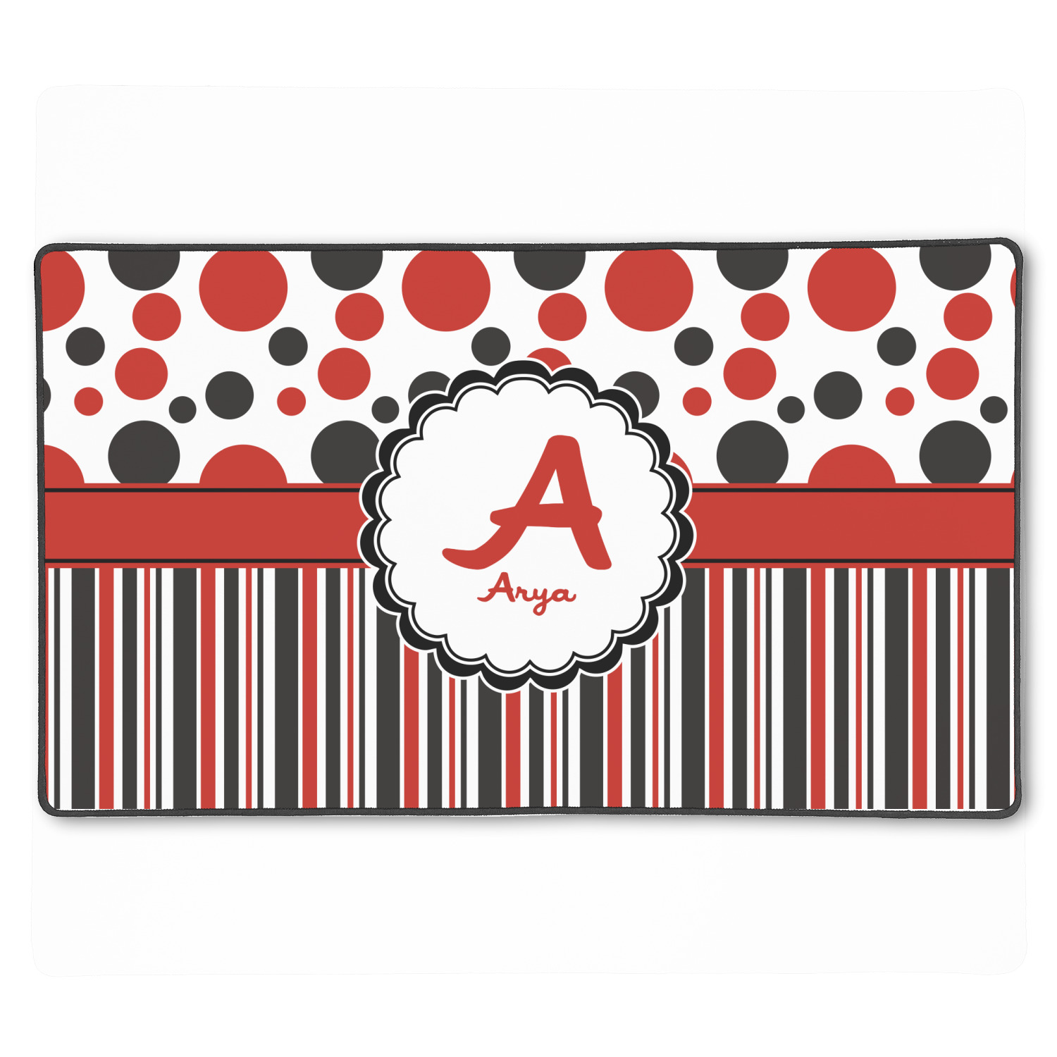 The classic red, black, and white color scheme has been revived with a touch of fun. The top part of this design if filled with different shaped polka dots in black and red that pop on a white background. The bottom half of the design has coordinating colored stripes that complete this fun look.