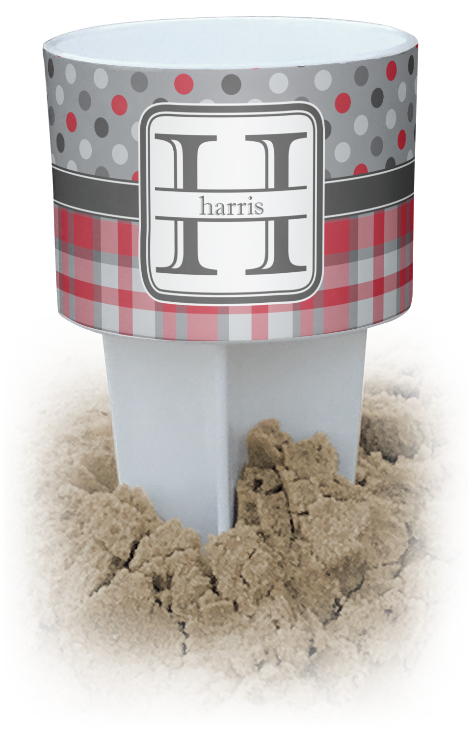 This cup holder has a large stake at its bottom that anchors it to the sand or ground below, while the cup holder rests above the stake. The entire drink holder is made of durable plastic and displays your customization around the cup holder portion. We sell these personalized beach spikers in two different colors: black and white.