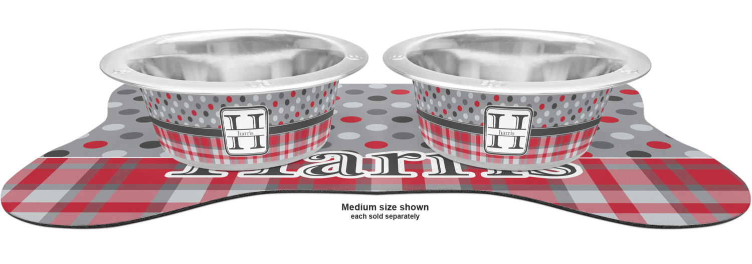 The top of this mat displays your custom design, as it is printed on polyester. To prevent slippage, the underside of the mat is made of rubber. We offer a small dog food mat, suitable for smaller dogs and a large dog food mat for bigger breeds. The small dog food mat is approximately 19 by 13 inches, while the large dog feeding mat measures at approximately 26.75 by 18 inches. Both personalized mats are ideally sized to fit two dog bowls.
