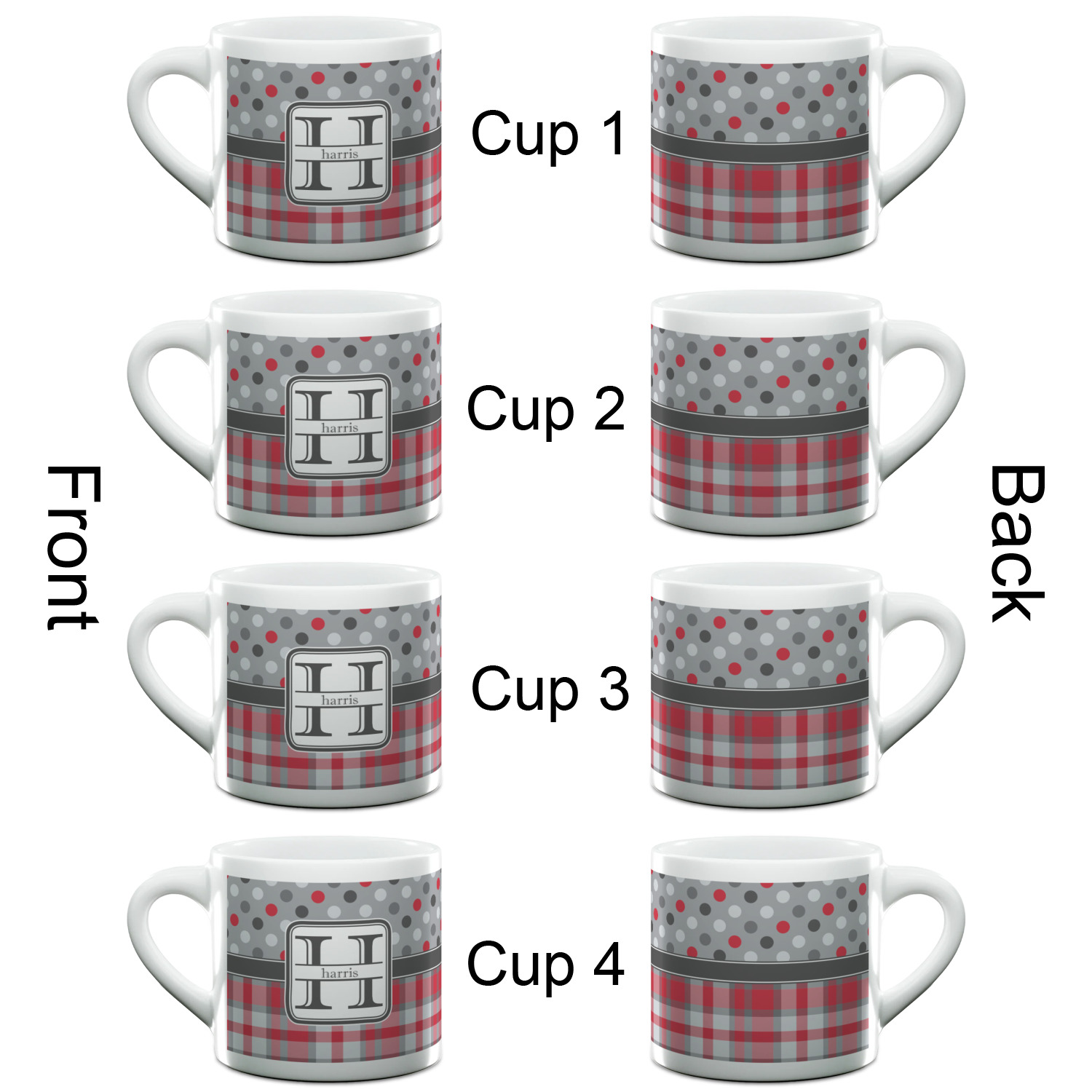 Each of our espresso mugs is a ceramic material sure to keep your drink warm. Personalize one cup for yourself, or order a set of 4! Its the perfect little gift for any coffee lover! We carry two sizes for you to personalize - 3 oz. (approx. 3.25" x 2.325" x 2.625") or 6 oz. (approx. 4" x 2.9" x 2.9"). Our 3 oz. mug is perfect for that single shot espresso while our 6 oz. mug can be your next favorite cappuccino cup holding two shots of espresso!