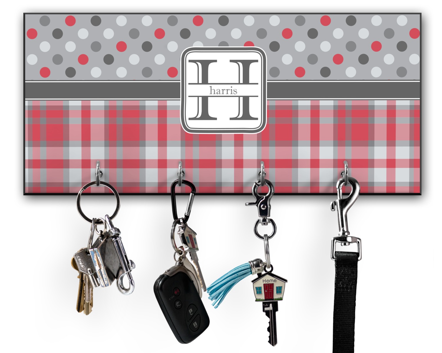 This 11" x 5" key hanger is made of sturdy wood and has four metal hooks lining the bottom. This is the perfect size for a family with several drivers. Not only can you hang keys on it though, but pet leashes and other small items. The board is black on the sides and back and is printed with the design of your choice on the front.
