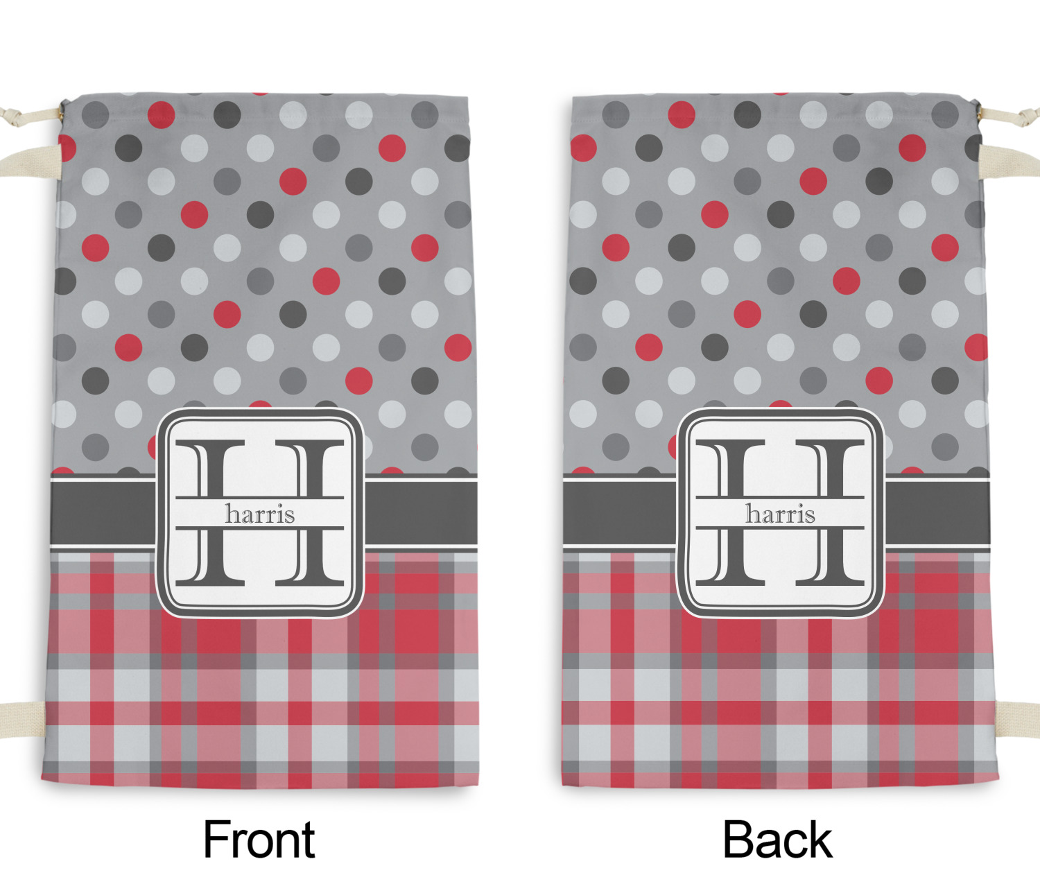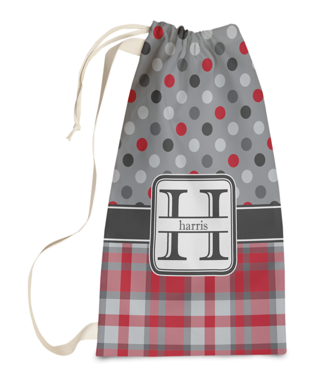 Carry your laundry in style with these customized laundry bags. Available in two sizes, featuring a natural colored woven strap and a cinch cord, these bags hold a lot of clothes or anything else you want to fit in them.