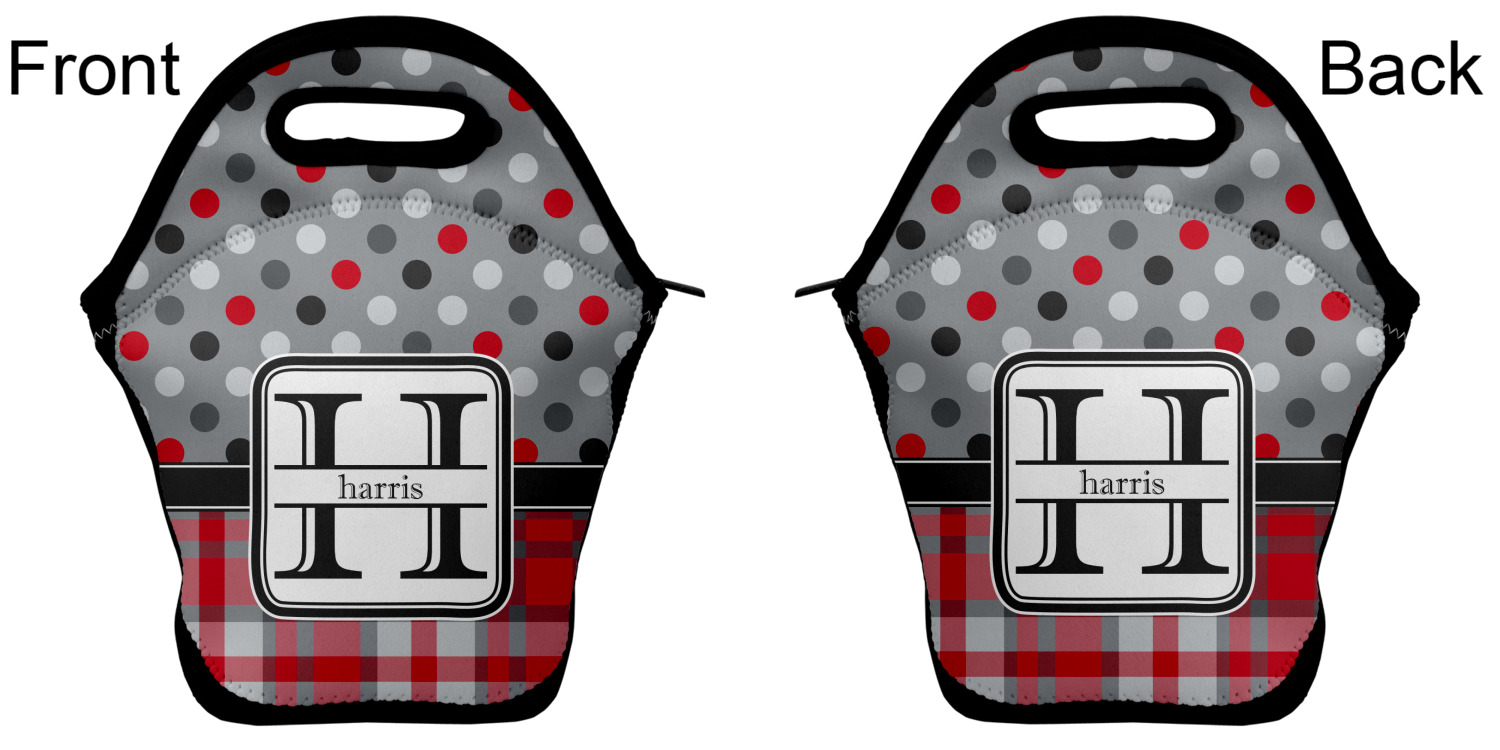 Our personalized lunch bags are made from a strong neoprene, and secure with a zipper closure that lines the top of the bag.The edges of the neoprene are sewn together with a heavy duty stitch, adding to the durability of the bag. The is accompanied by a reinforced handle at its top, for the easy transport of your lunch. We display your personalization across both the front and back of this neoprene lunch bag, while the remaining sides are a sleek black in color. Each bag measures at 13.5 inches tall, and 11.5 inches wide.