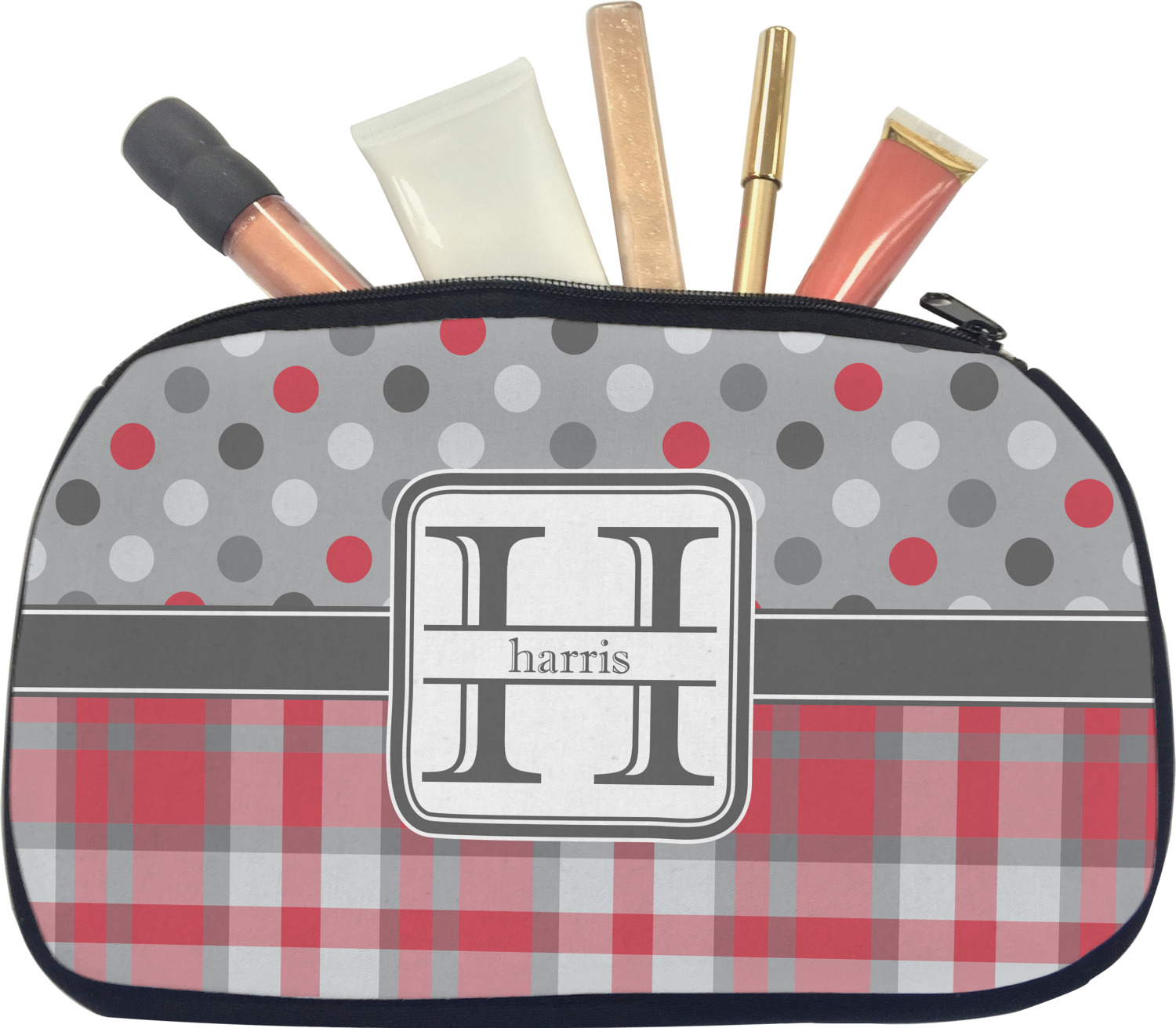 Our personalized makeup bags are available in many different designs, patterns and colors - so you are sure to find one that will love. They are made of neoprene (same material as wet-suits) and thus are water resistant, so spillages in your makeup bag will not end up all over you purse. They are customized on one side and are black on the other side and the zipper is black as well.