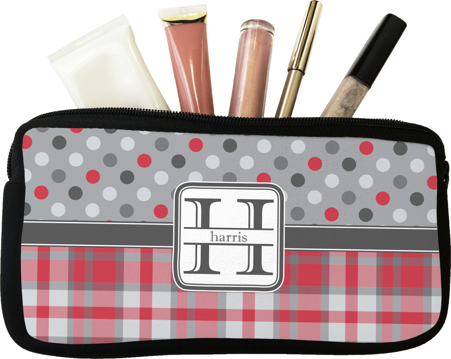 Our personalized makeup bags are available in many different designs, patterns and colors - so you are sure to find one that will love. They are made of neoprene (same material as wet-suits) and thus are water resistant, so spillages in your makeup bag will not end up all over you purse. They are customized on one side and are black on the other side and the zipper is black as well.