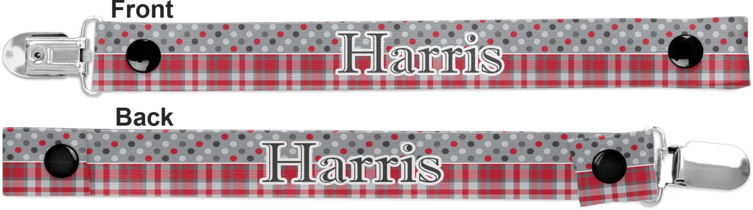 This personalized pacifier clip is the ideal size and measures at approximately 7.5 inches in length, when either end is snapped closed. On one end, you'll find a snap button. This button of your baby's pacifier holder is what can be attached to their pacifier to hold is securely in place. Simply open the snap, slip it through the pacifier opening, and snap it back into place. On the opposite end of this baby pacifier holder, you'll find a metal clip that can secure to a baby's collar or sleeve. This clip ensures that the strap stays in place, and that your baby's pacifier is always on hand.