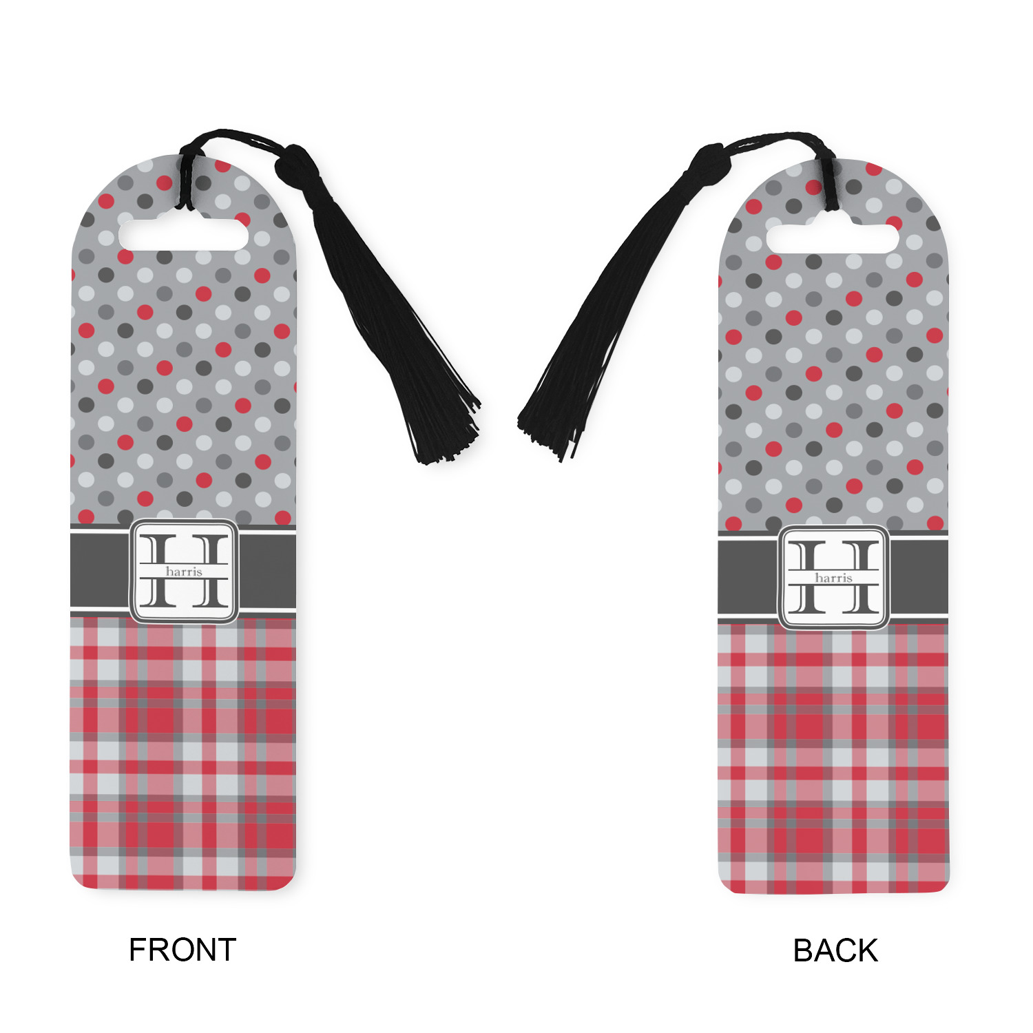 Made from a durable, flexible plastic, these bookmarks are printed with your custom design on them. With the tassel on them they make it easy to find your page in your book. These are a rectangular shape 7 1/4 inches tall with a rounded top and are approximately 2 1/4 inches wide.