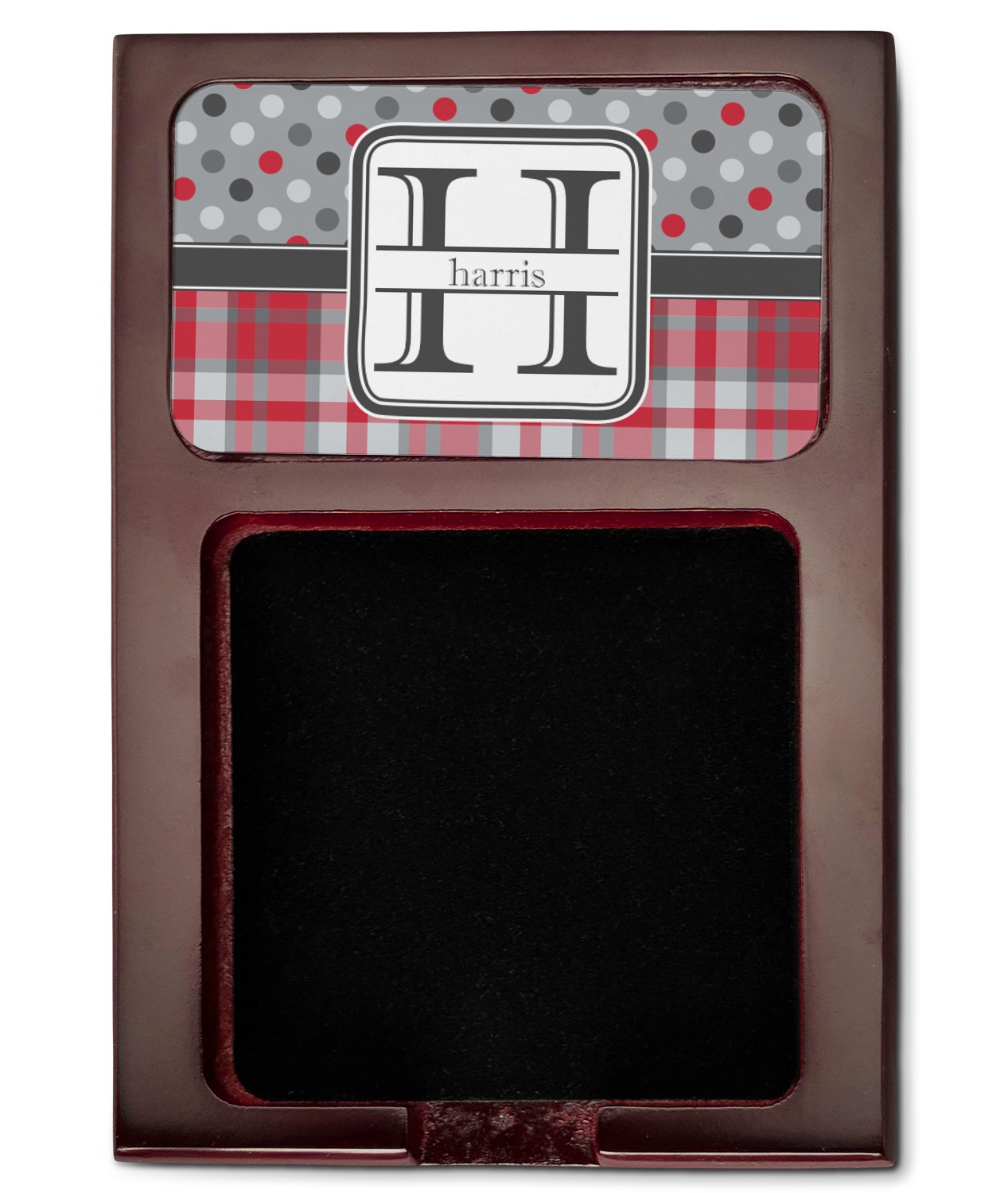 Crafted from a fine mahogany, this post it note holder is in the shade of a dark, cherry color. The dispenser itself is about 4.25 by 6.25 by 0.75 inches. You can place your 3 by 3 inch sticky notes in the indentation below the nameplate. We print your customization onto the nameplate that rests above the velvety indentation.