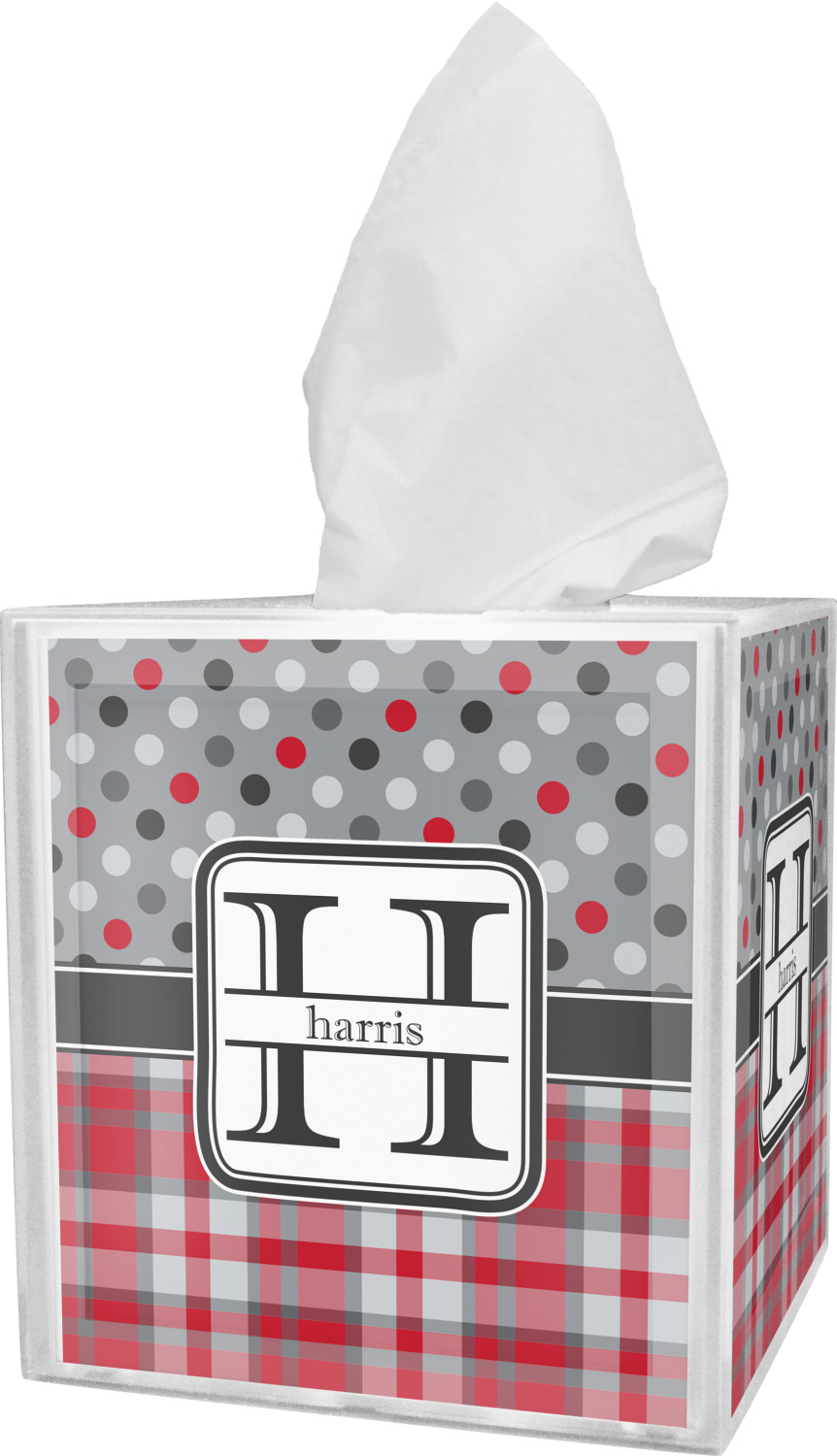 These tissue holders are built from durable acrylic and display your unique personalization on fine-quality vinyl inserts placed within the four sides and top. The box features two pieces, allowing you to easily switch out tissue boxes. On the sides, youll find ridges that ensure the top and base fit securely in place. The bottom of these tissue box holders has four, rubber, non-slip pads to prevent the box from scuffing any surface you decide to display it on. Each box can fit a standard 5 by 5-inch box of tissues.