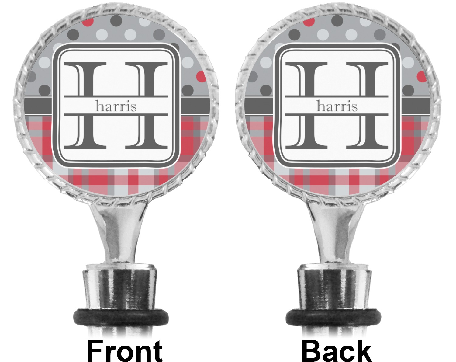 The top part of your bottle stopper is comprised of a zinc ring that displays your customization(s) in its middle, on both sides. The ring is heavy duty, with a bright chrome finish. The body of the wine stoppers have two silicone rings to provide an airtight seal. These wine bottle stoppers measure at 1.625" L x 0.8125" W x 4.625" H; your custom wine stopper is meant to fit into most standard-sized wine bottles.