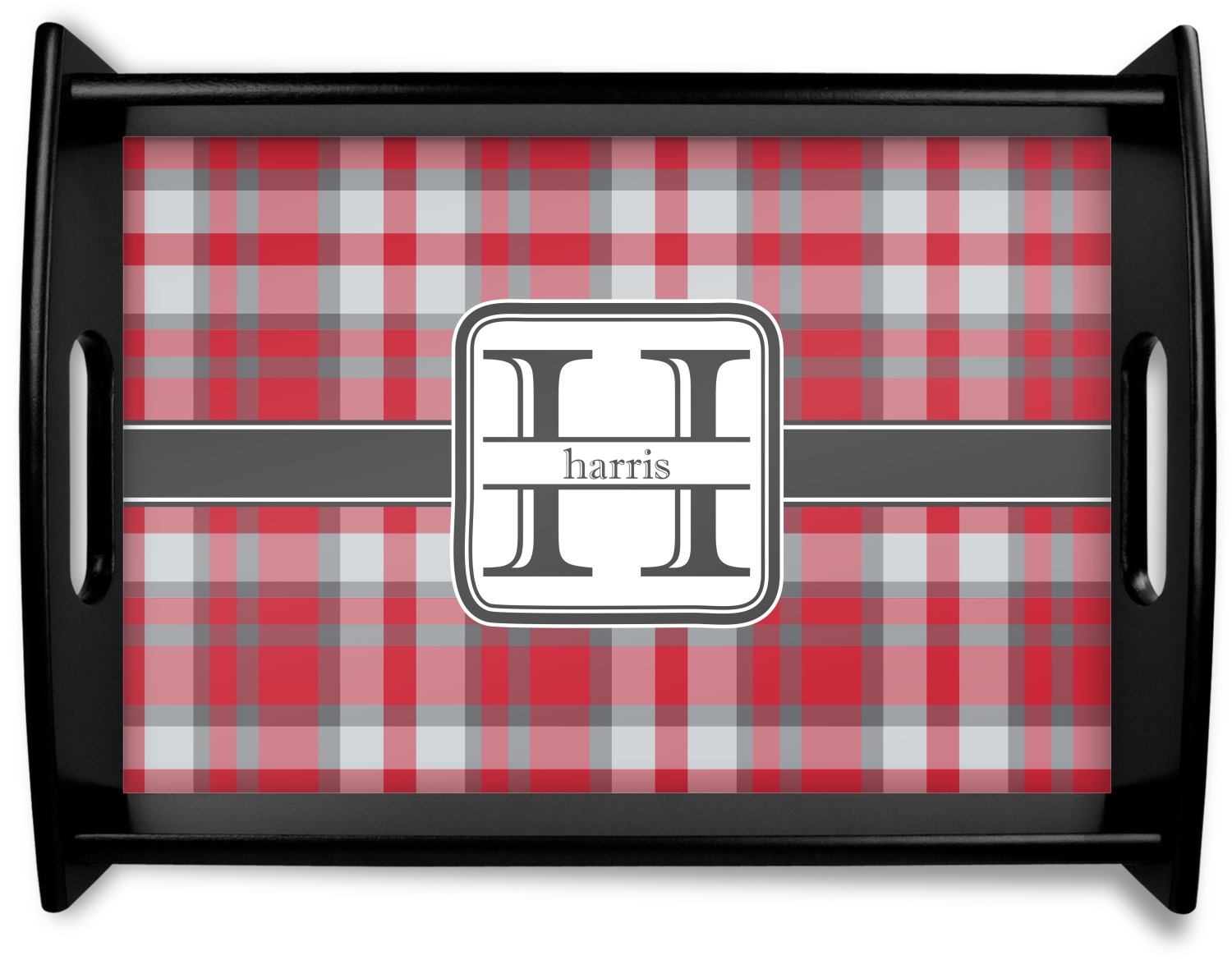 This serving tray with handles features square edges and two rounded sides, creating a very modern look. Each side is fabricated from a beautifully cut, natural wood. The bottom of the interior of the tray displays your customized design in bright, vibrant color. The tray is sold in both a black color and a natural wood look. Each variation of the wood serving tray has two sizes: Small, which is 14" x 10" x 2.25", and Large, which is 19.5" x 13.5" x 2.75".