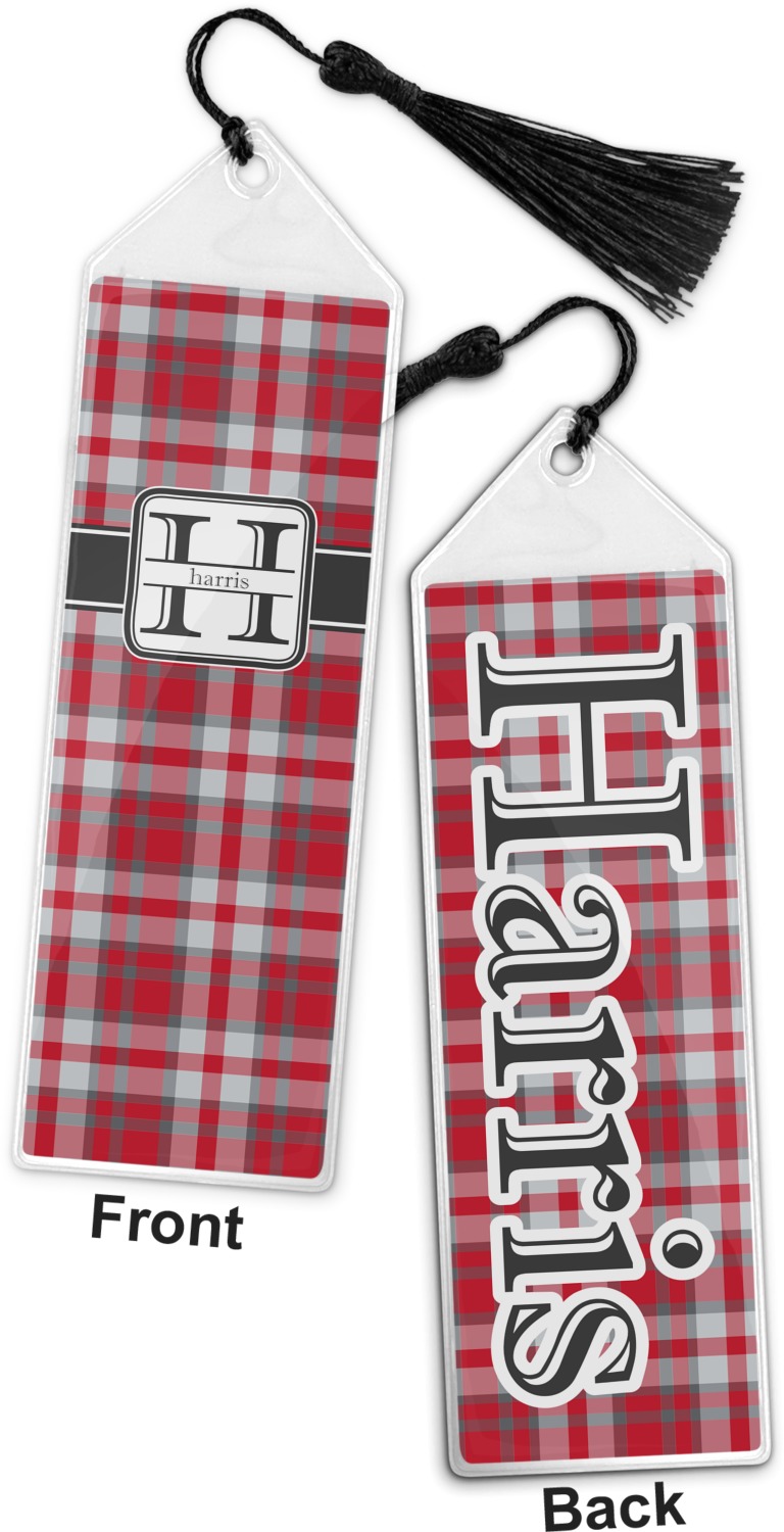 Your personalized bookmark is made of a sturdy, clear vinyl, and is approximately 7.5" x 2.25". We display your personalization on vinyl inserts that are placed on both sides. Accompanying each book marker is a black, fringe tassel that attaches to the reinforced, triangular header.