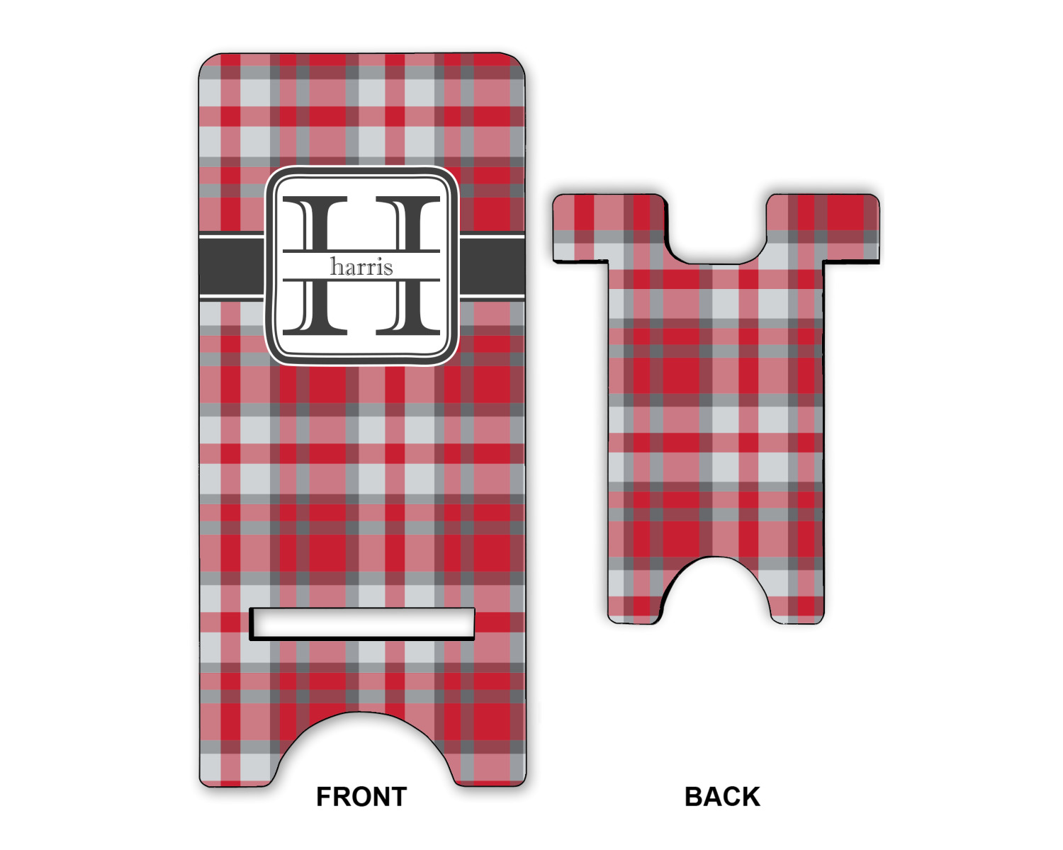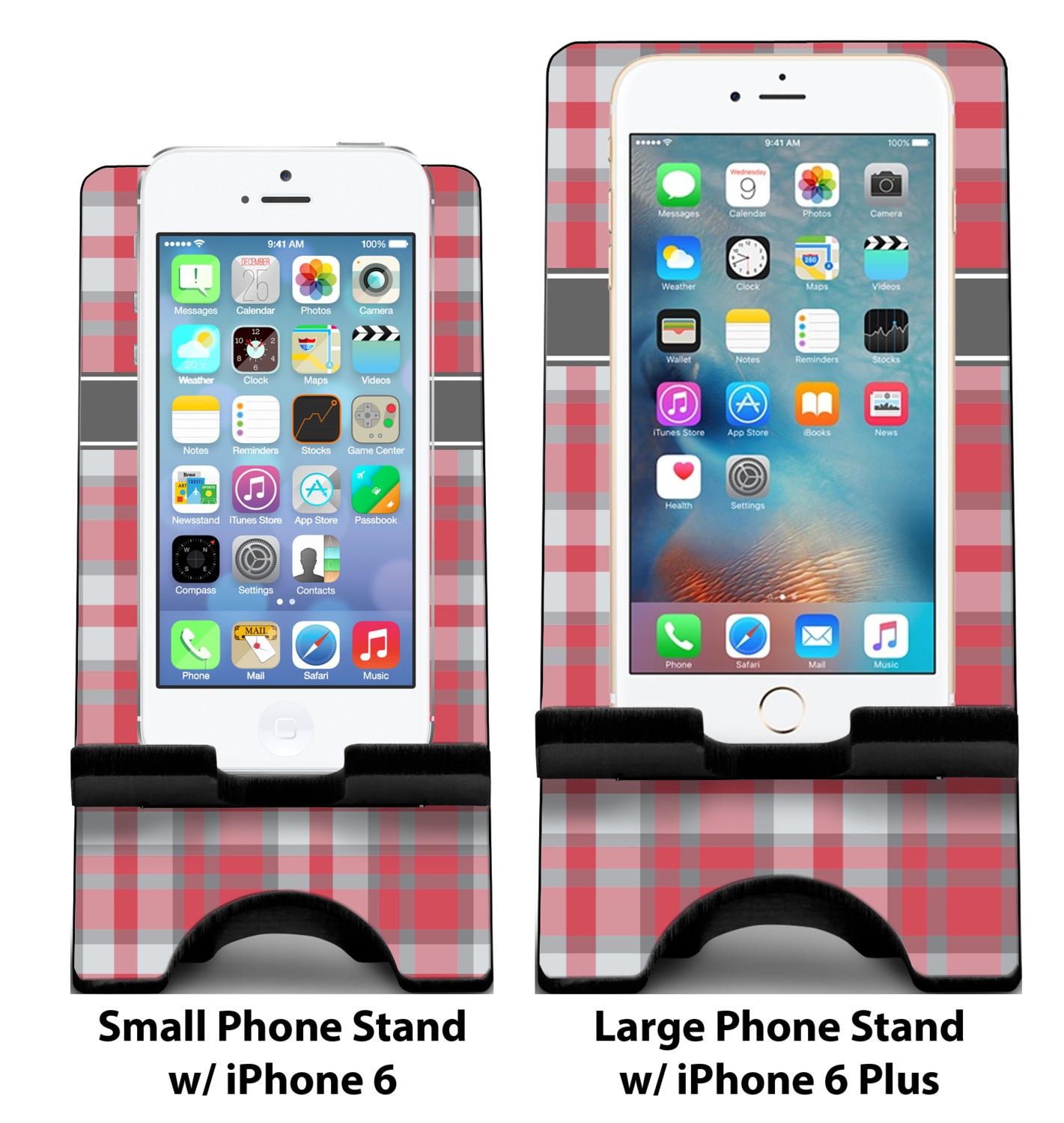 To meet your needs, we offer four variations of this IPhone stand. The backboard of the first version is shaped as a plain, yet sleek rectangle, and is available in two sizes. Our smaller size is approximately 4 by 3.25 by 7 inches, while the larger model is 4 by 3.77 by 8.5 inches. Alongside this model, we also provide you with a more decorative option. The upper part of our second version features a curved edge, for a classy, suave appearance. This phone holder is also sold in two sizes: a smaller version, which is 4 by 3.25 by 7 inches, and our larger model, which is 4 by 3.77 by 8.5 inches. Both models will support large phones, but the larger model is better if you wish to proudly display your personalized design.