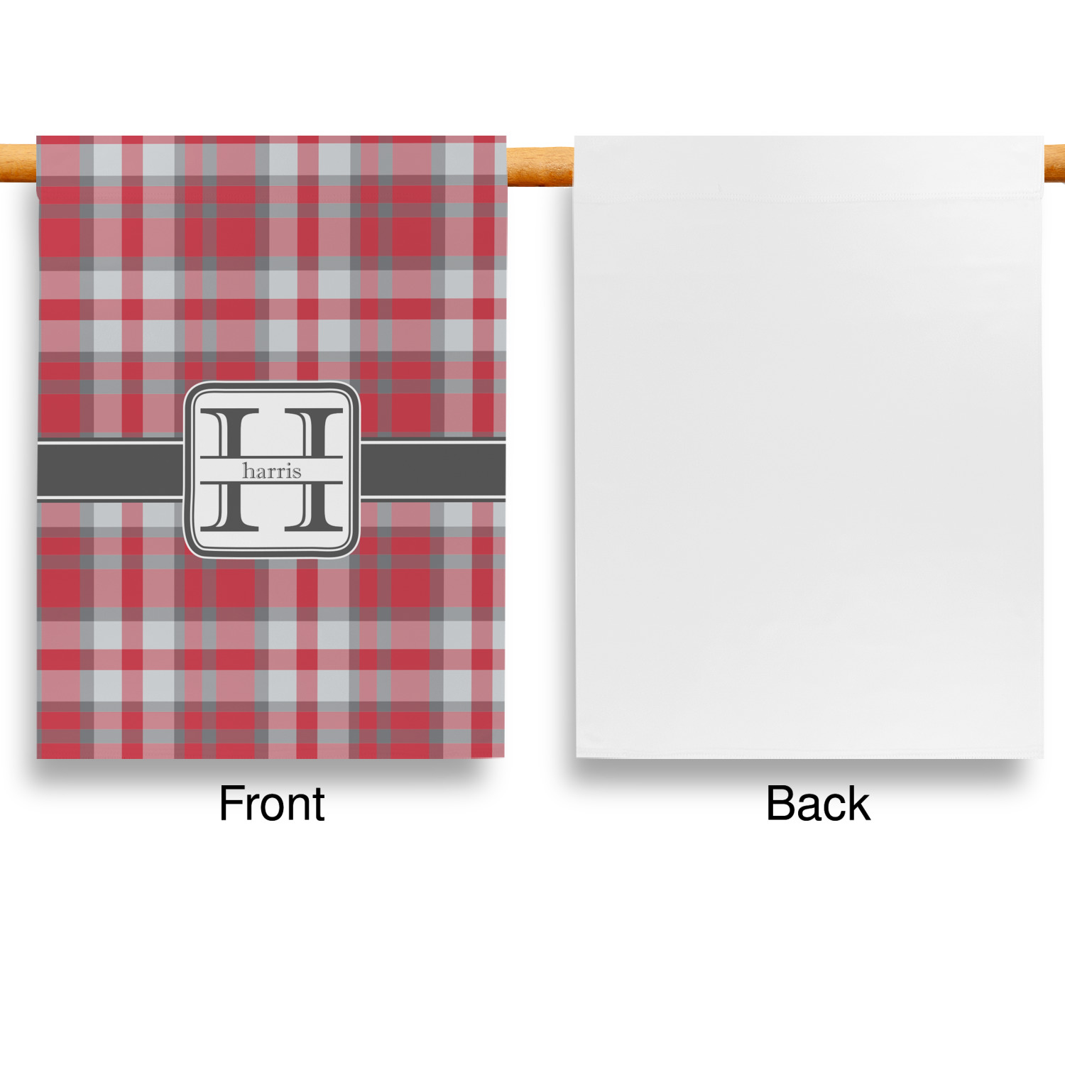These custom garden flags are made of a durable, double-ply, polyester weave, allowing them to withstand the elements year round. The small flags measure at approximately 12 by 18 inches. The large flags measure out to 28 by 37 inches. You can order these decorative flags with your customization printed on the front only, or the front and back.