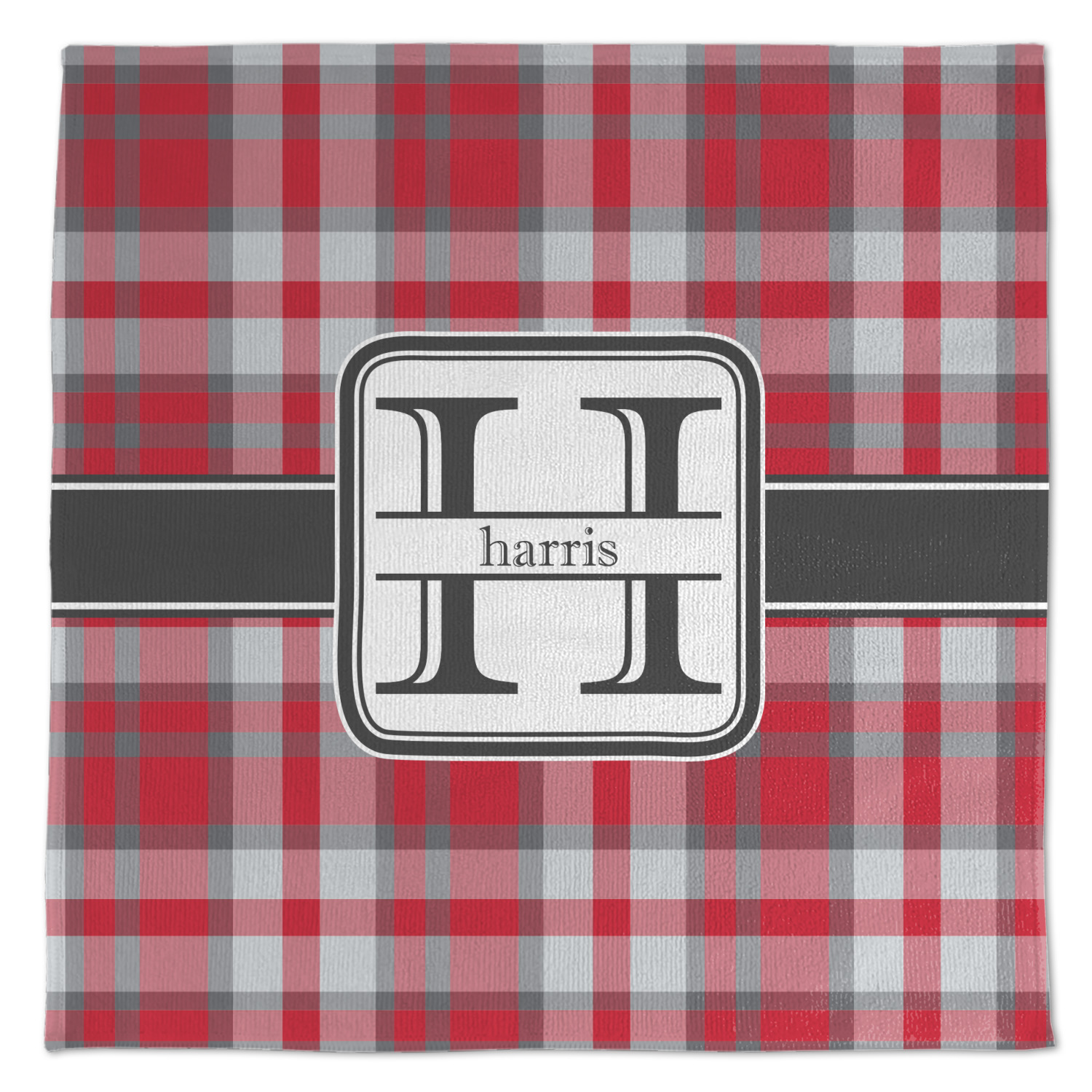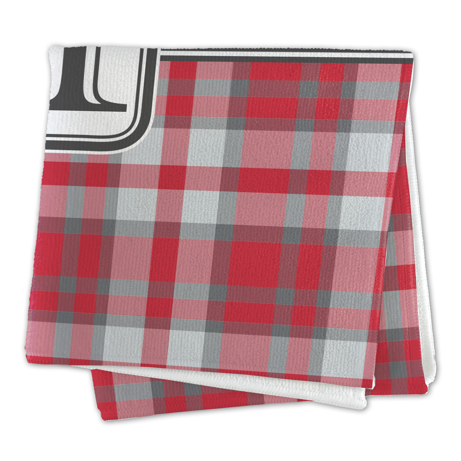 The design has a classic gray ribbon trimmed in white. The rounded square white label trimmed in a double row of gray highlights a gray initial of your choice.
