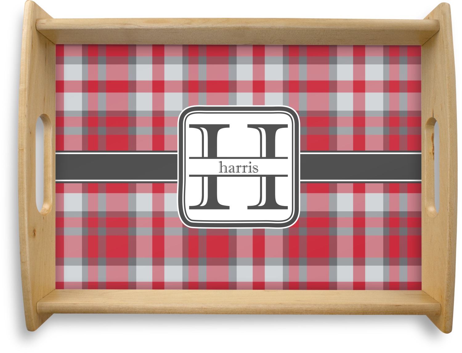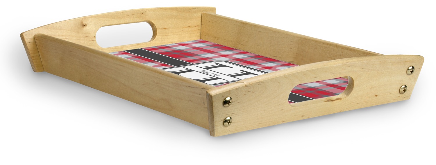 This serving tray with handles features square edges and two rounded sides, creating a very modern look. Each side is fabricated from a beautifully cut, natural wood. The bottom of the interior of the tray displays your customized design in bright, vibrant color. The tray is sold in both a black color and a natural wood look. Each variation of the wood serving tray has two sizes: Small, which is 14" x 10" x 2.25", and Large, which is 19.5" x 13.5" x 2.75".