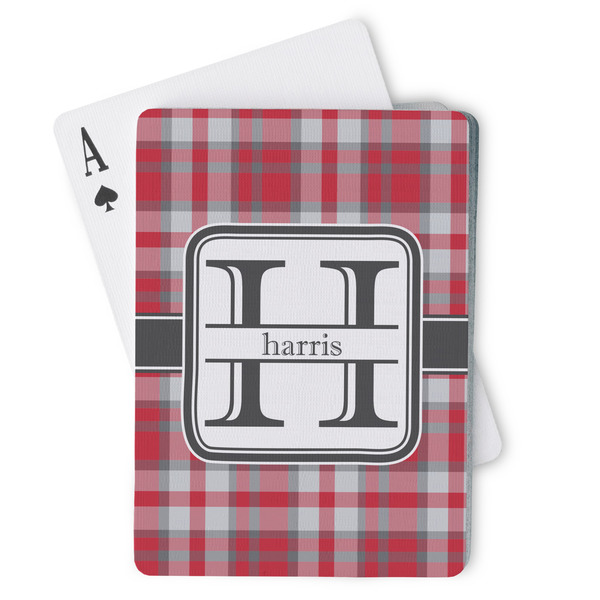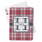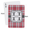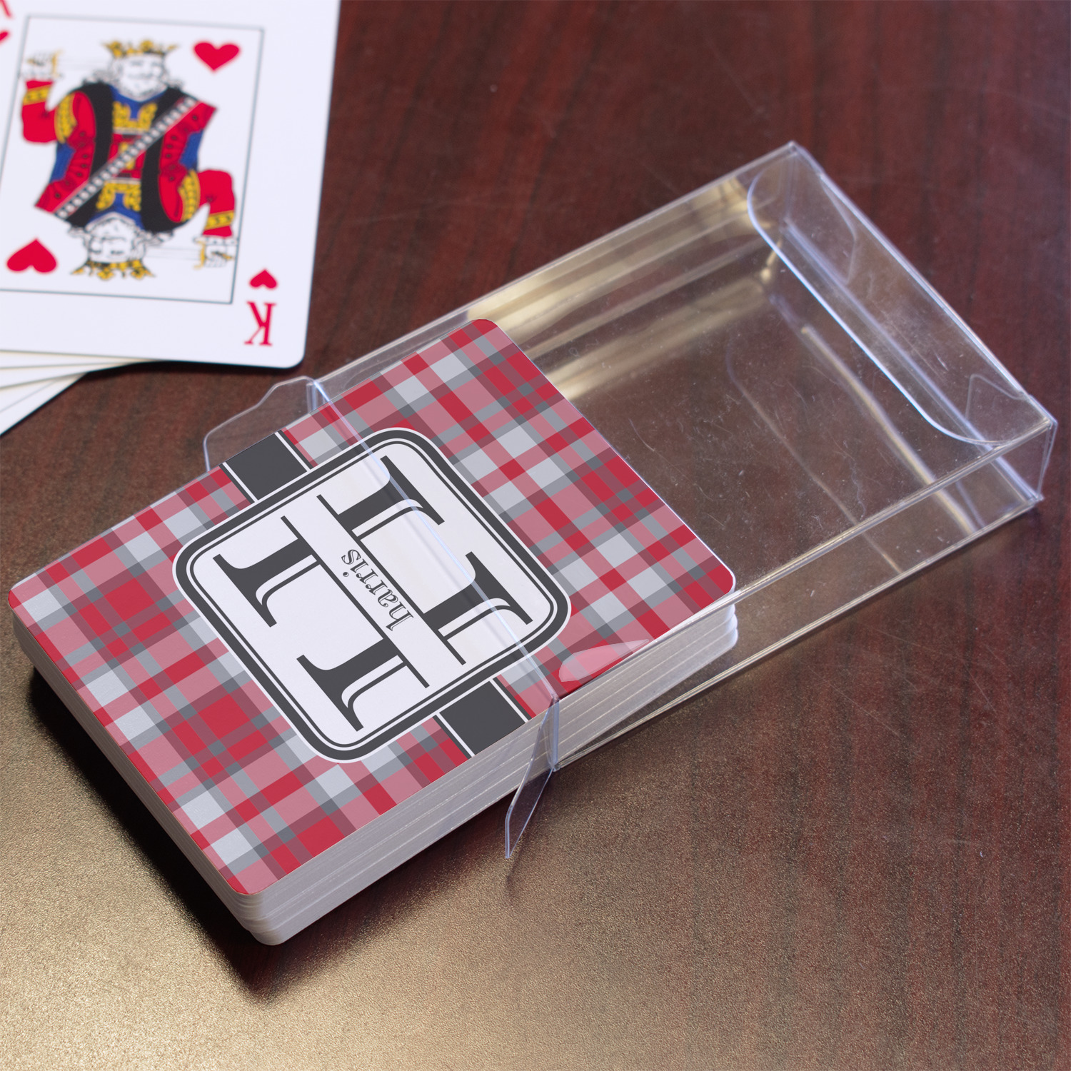 The customization / personalization is printed on the back side. The playing cards have a low gloss coating on both sides. The cards are packaged in a clear plastic box.