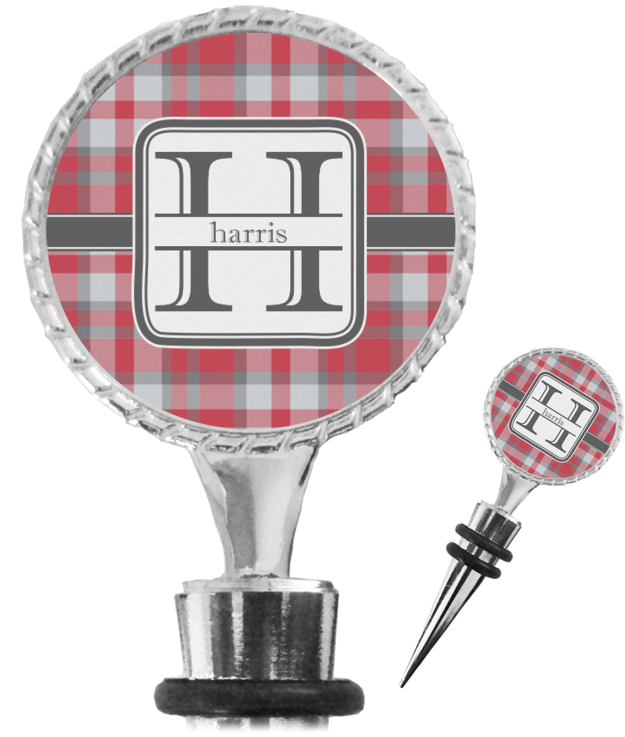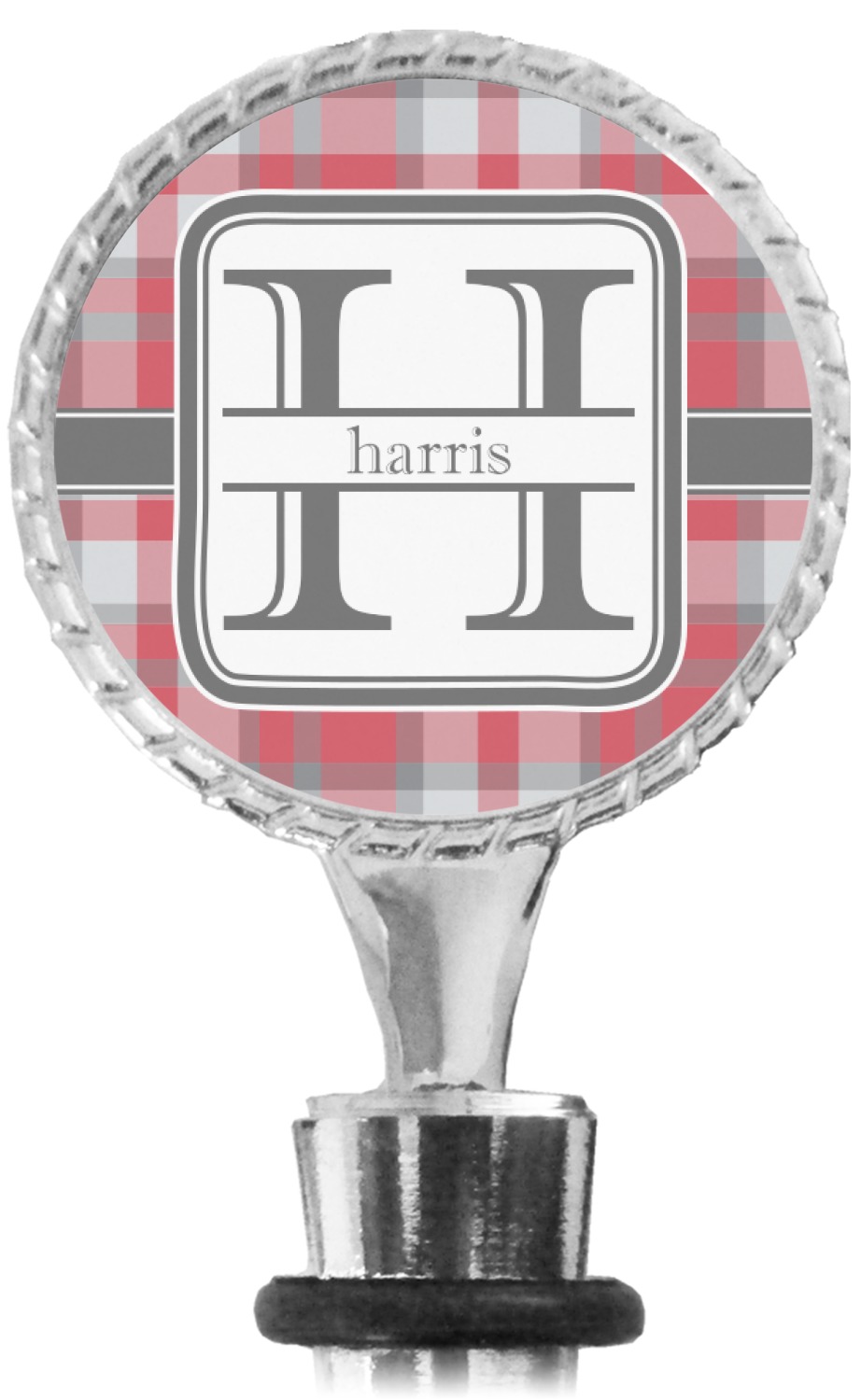 The top part of your bottle stopper is comprised of a zinc ring that displays your customization(s) in its middle, on both sides. The ring is heavy duty, with a bright chrome finish. The body of the wine stoppers have two silicone rings to provide an airtight seal. These wine bottle stoppers measure at 1.625" L x 0.8125" W x 4.625" H; your custom wine stopper is meant to fit into most standard-sized wine bottles.