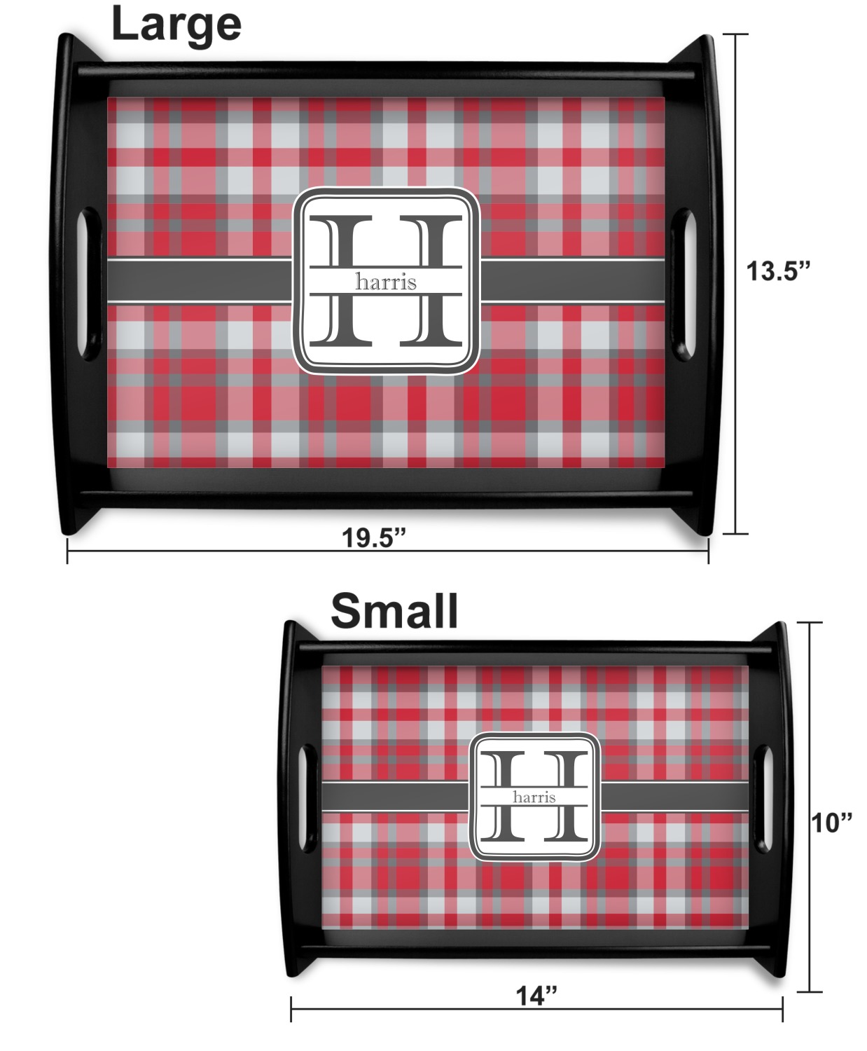 This serving tray with handles features square edges and two rounded sides, creating a very modern look. Each side is fabricated from a beautifully cut, natural wood. The bottom of the interior of the tray displays your customized design in bright, vibrant color. The tray is sold in both a black color and a natural wood look. Each variation of the wood serving tray has two sizes: Small, which is 14" x 10" x 2.25", and Large, which is 19.5" x 13.5" x 2.75".