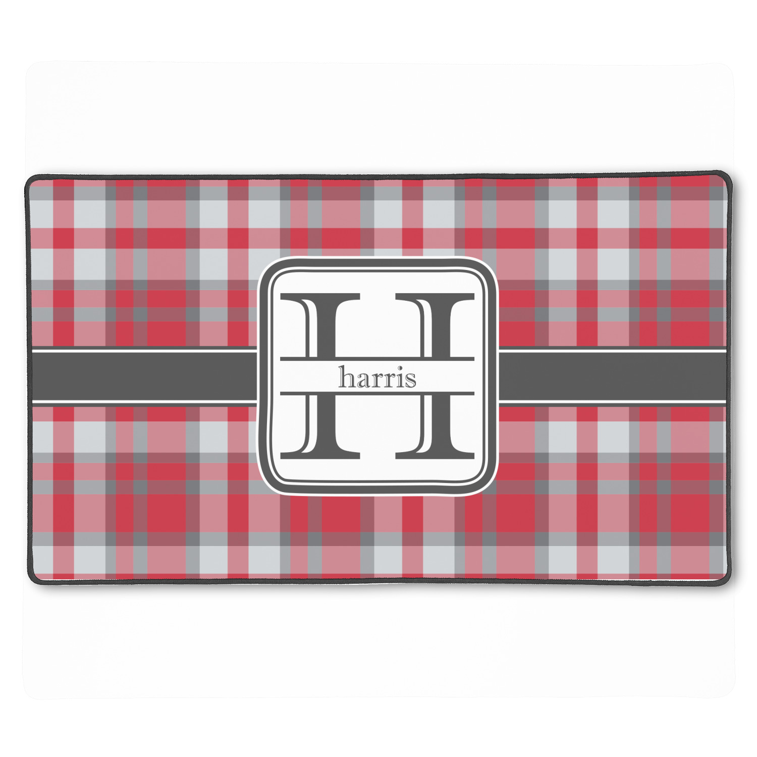 The design has a classic gray ribbon trimmed in white. The rounded square white label trimmed in a double row of gray highlights a gray initial of your choice.