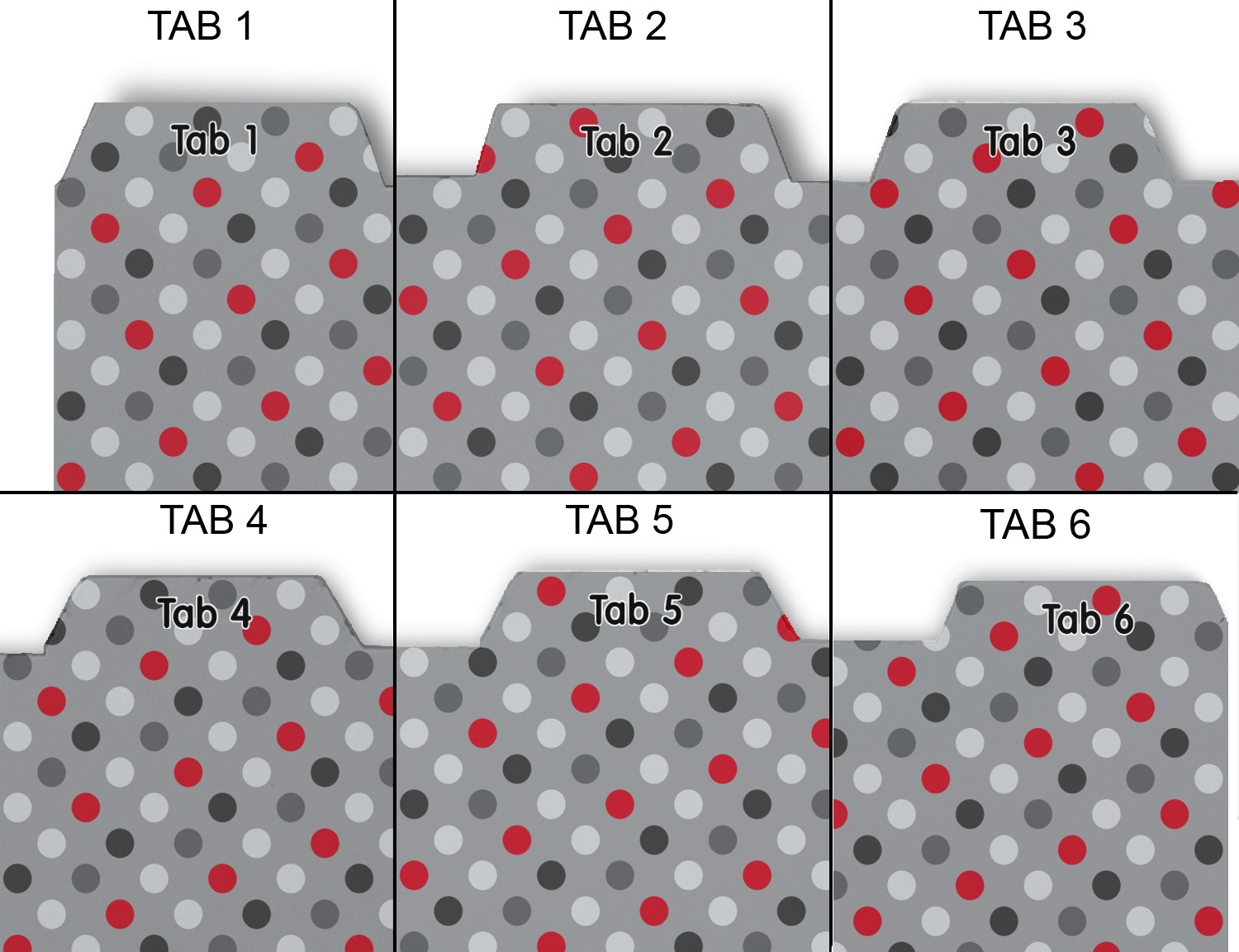 Whether you use binders at school or at work, we have designs to suit all of them. Available in 5 or 6 tab sets, you are sure to find a set to suit your needs. The back of each one is white and can be used to take notes, write vital information on, etc.