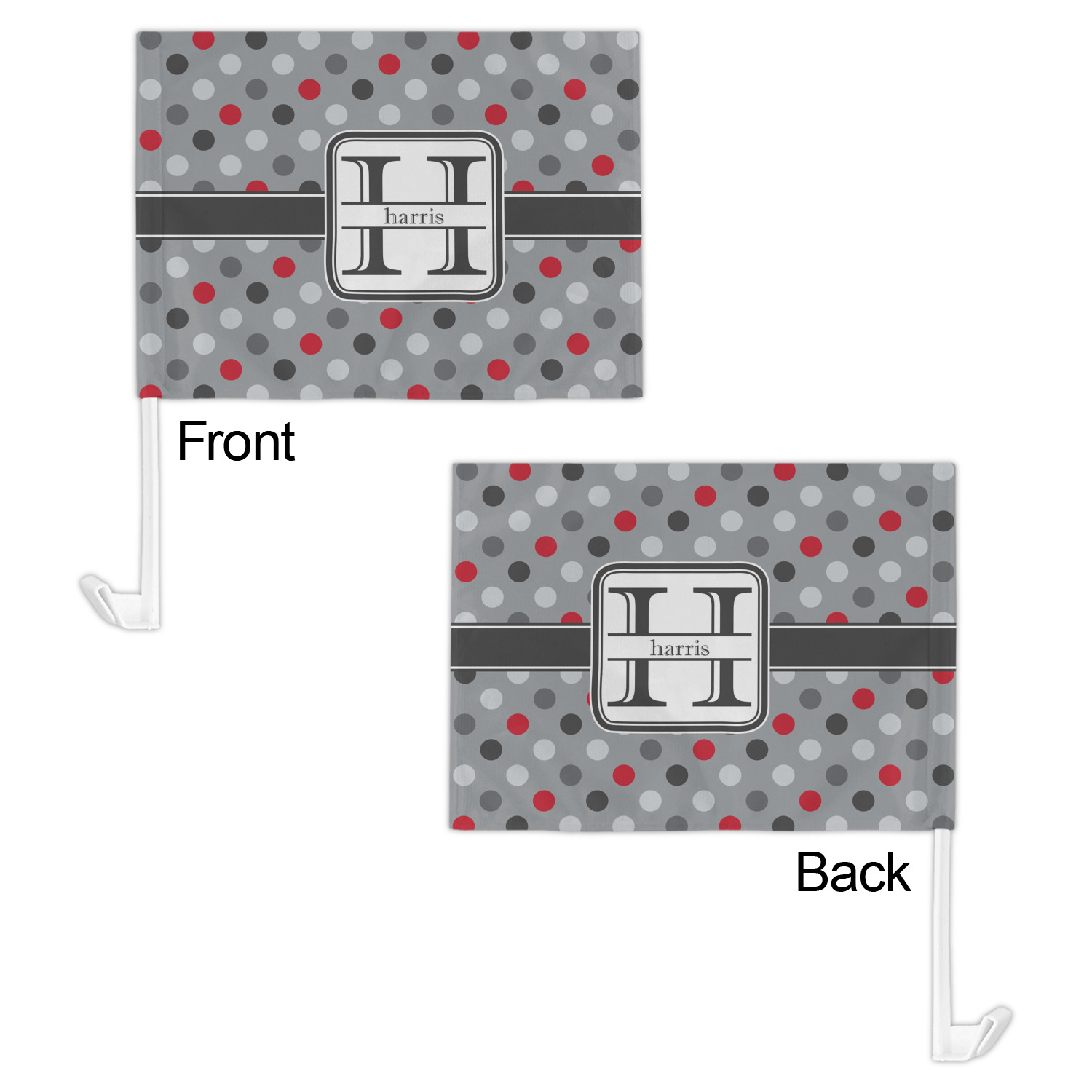 Our personalized flags are made from a durable, yet lightweight cloth that will proudly bear your logo or design of choice, while withstanding the outside elements. We have two size options - 8" x 11" and 11" x 15". Both come with a flag pole which includes a clip that secures the pole to the side window, whether it is rolled up or down. The flags are printed on both sides to display your design from all directions.