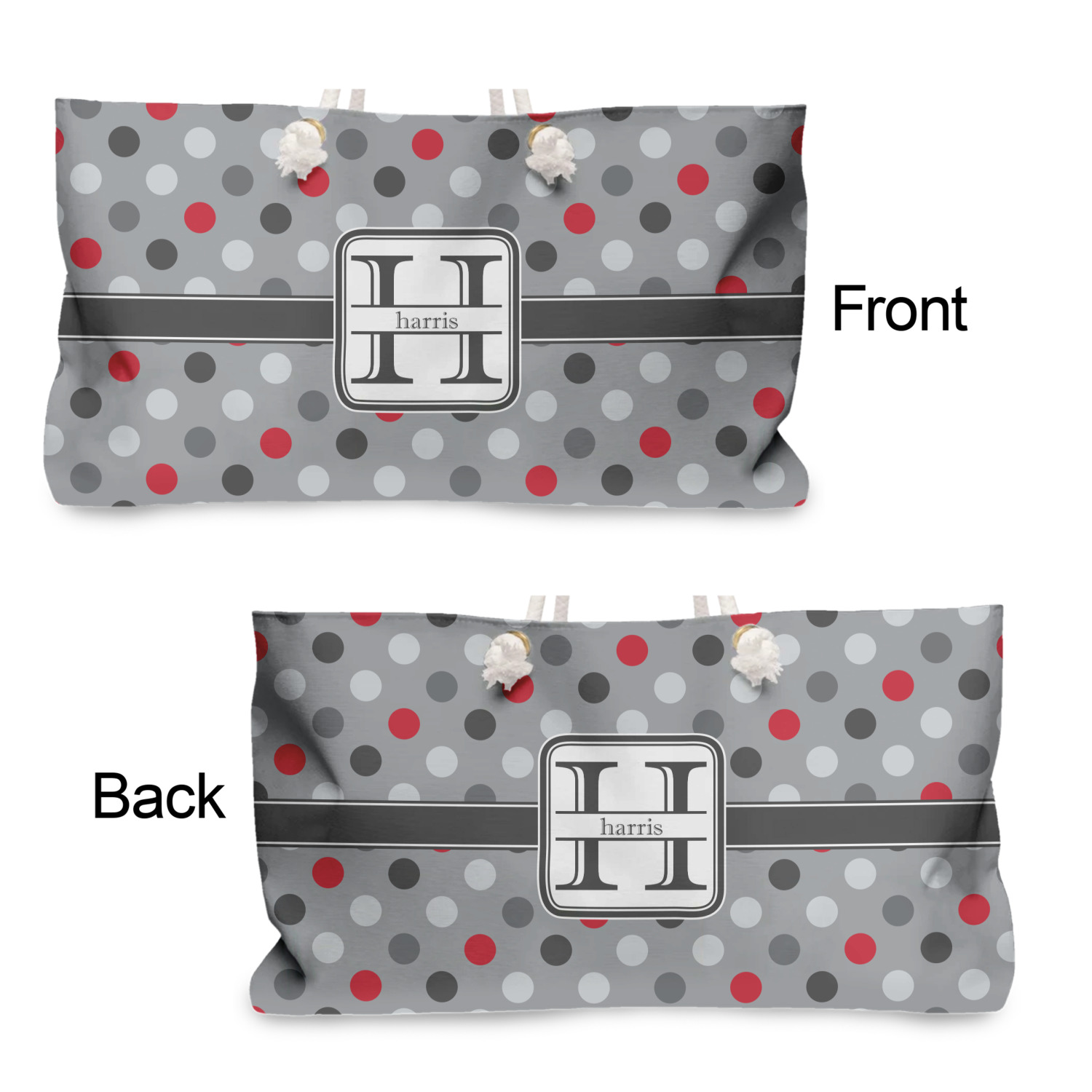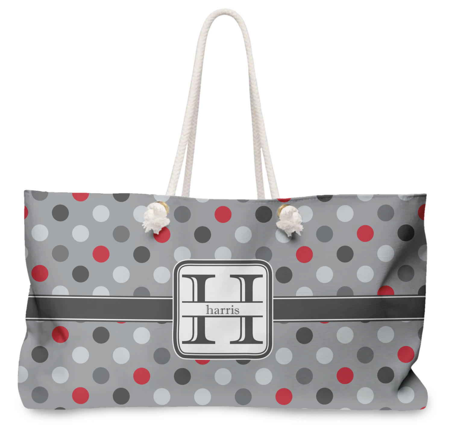 Our oversized weekender tote with rope handles is perfect for your weekend at the beach or on the town. This large tote are 24" W X 13" H, with a 5" gusset and a 27" thick rope handles with a knot that is put through a grommeted brass hole.