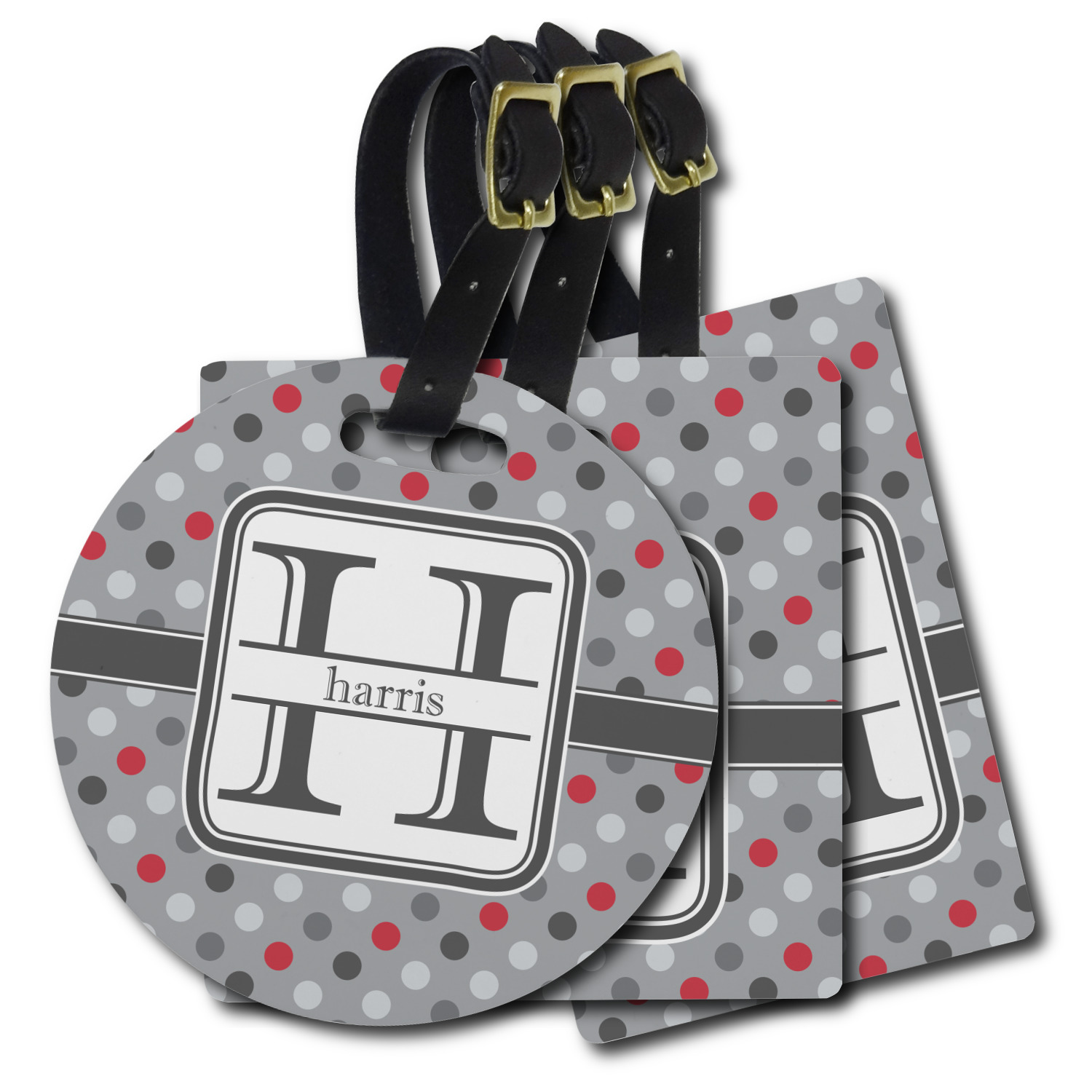 These personalized bag tags are sold in a variety of shapes, so that you may find the product that meets your vision exactly. We sell a round luggage tag, which measures at approximately 4" x 4". Our square luggage tag is about 3.5" x 3.5", while our rectangular version is 2.75" x 4 ".