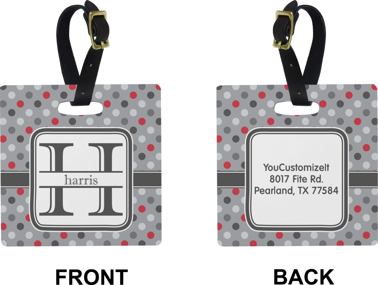 These personalized bag tags are sold in a variety of shapes, so that you may find the product that meets your vision exactly. We sell a round luggage tag, which measures at approximately 4" x 4". Our square luggage tag is about 3.5" x 3.5", while our rectangular version is 2.75" x 4 ".