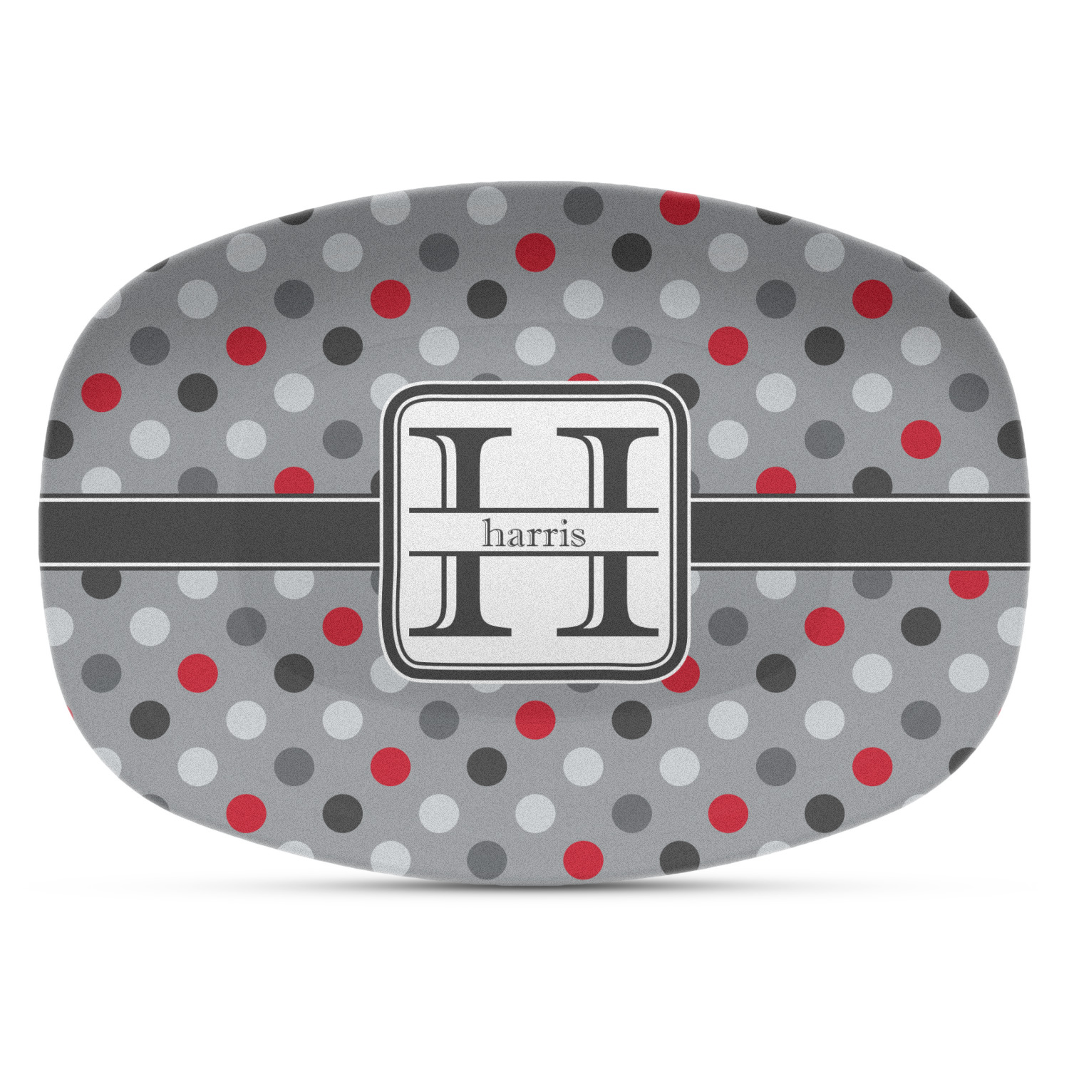 These serving platters are made from a composite, thermo-set, polymer plastic that gives it the versatility, durability, and weight of a melamine platter, without any of the downsides of melamine. These personalized platters, can withstand temperatures up to 250 degrees Fahrenheit, for up to 60 minutes. No harmful chemicals, such as BPA, formaldehyde, and DEHPs were used in the manufacturing of this product. This large serving platter measures at 14" x 10.25", and is spacious enough to hold any of your appetizers or bite-sized desserts. The platter exhibits your personalization across the entirety of its front.