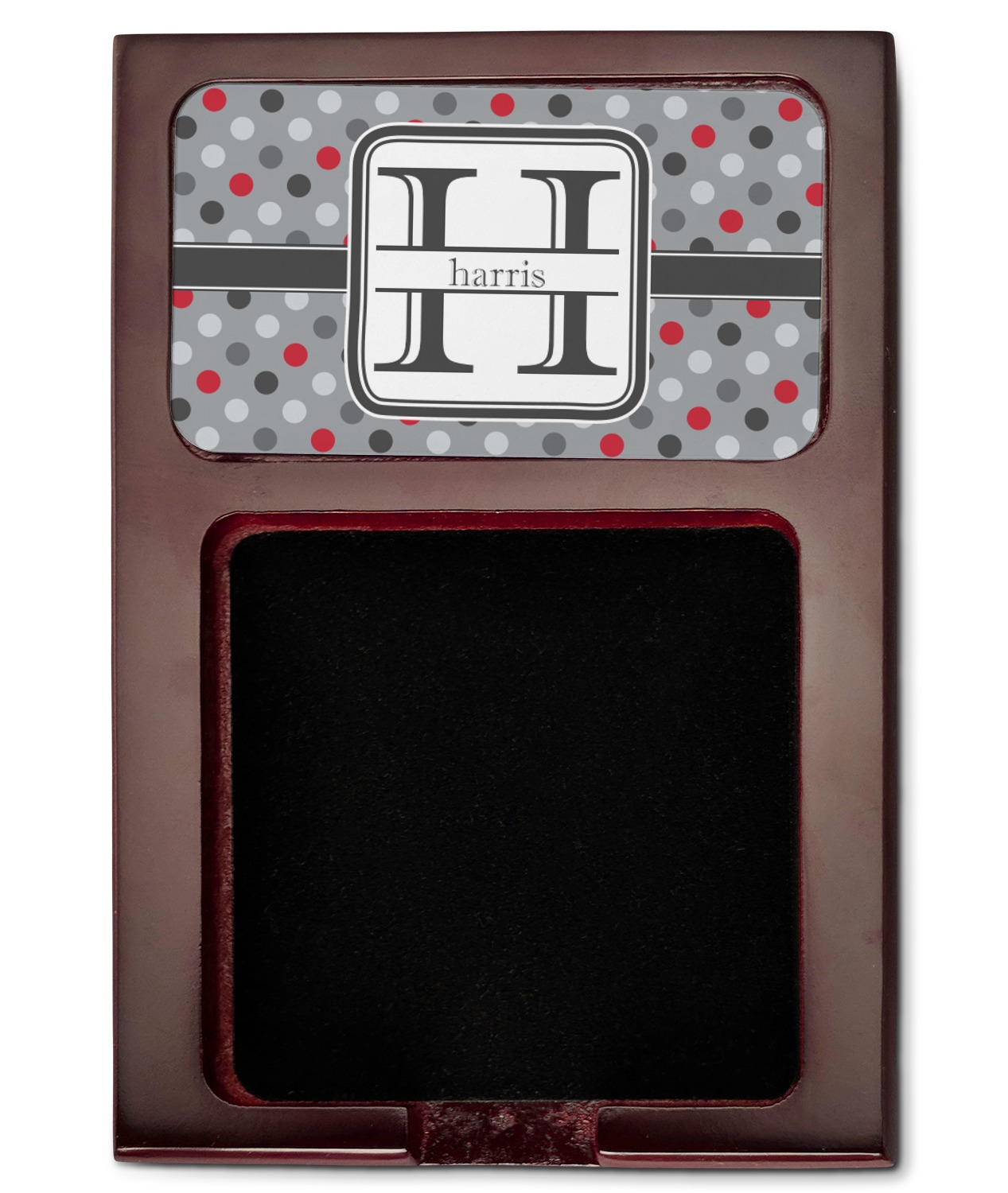 Crafted from a fine mahogany, this post it note holder is in the shade of a dark, cherry color. The dispenser itself is about 4.25 by 6.25 by 0.75 inches. You can place your 3 by 3 inch sticky notes in the indentation below the nameplate. We print your customization onto the nameplate that rests above the velvety indentation.