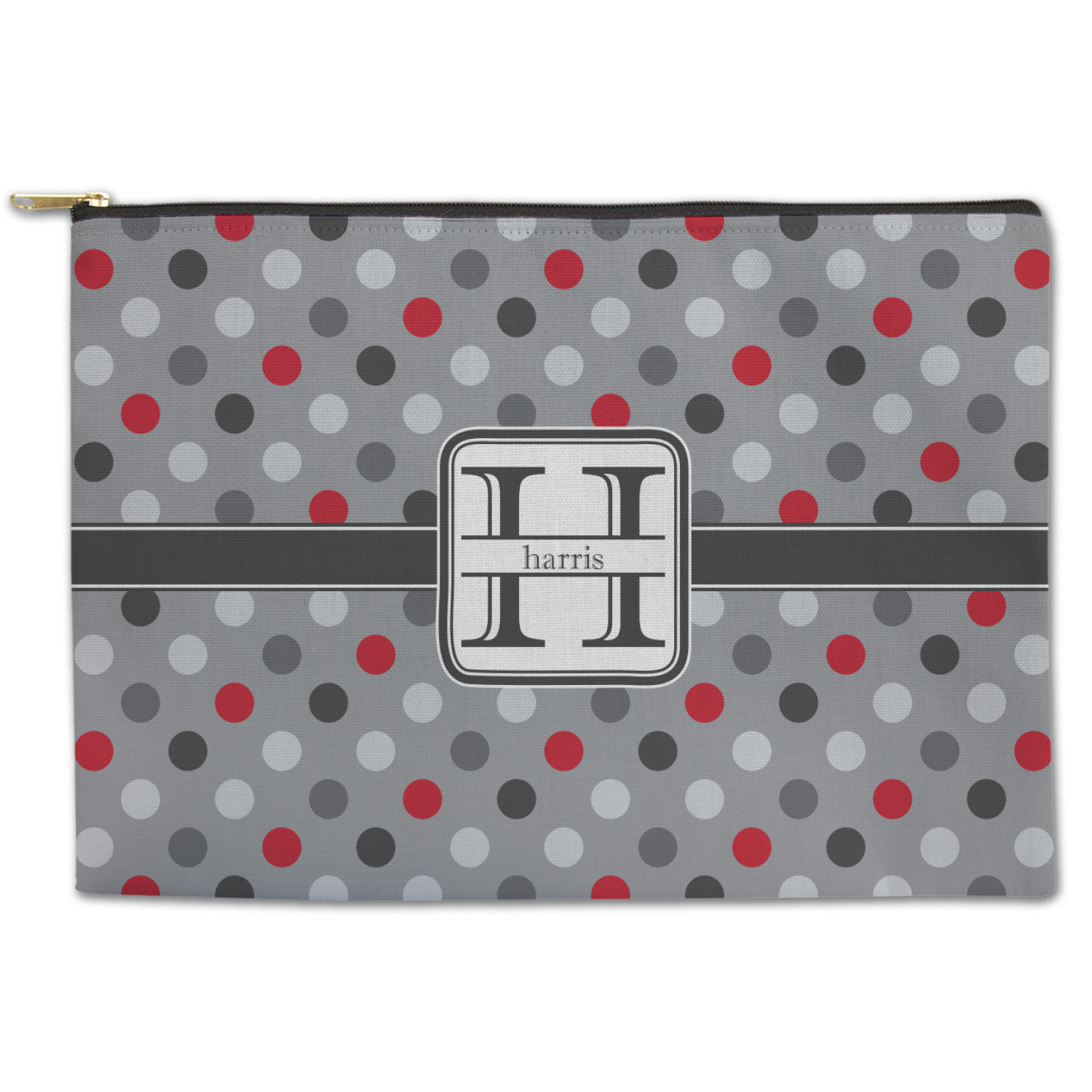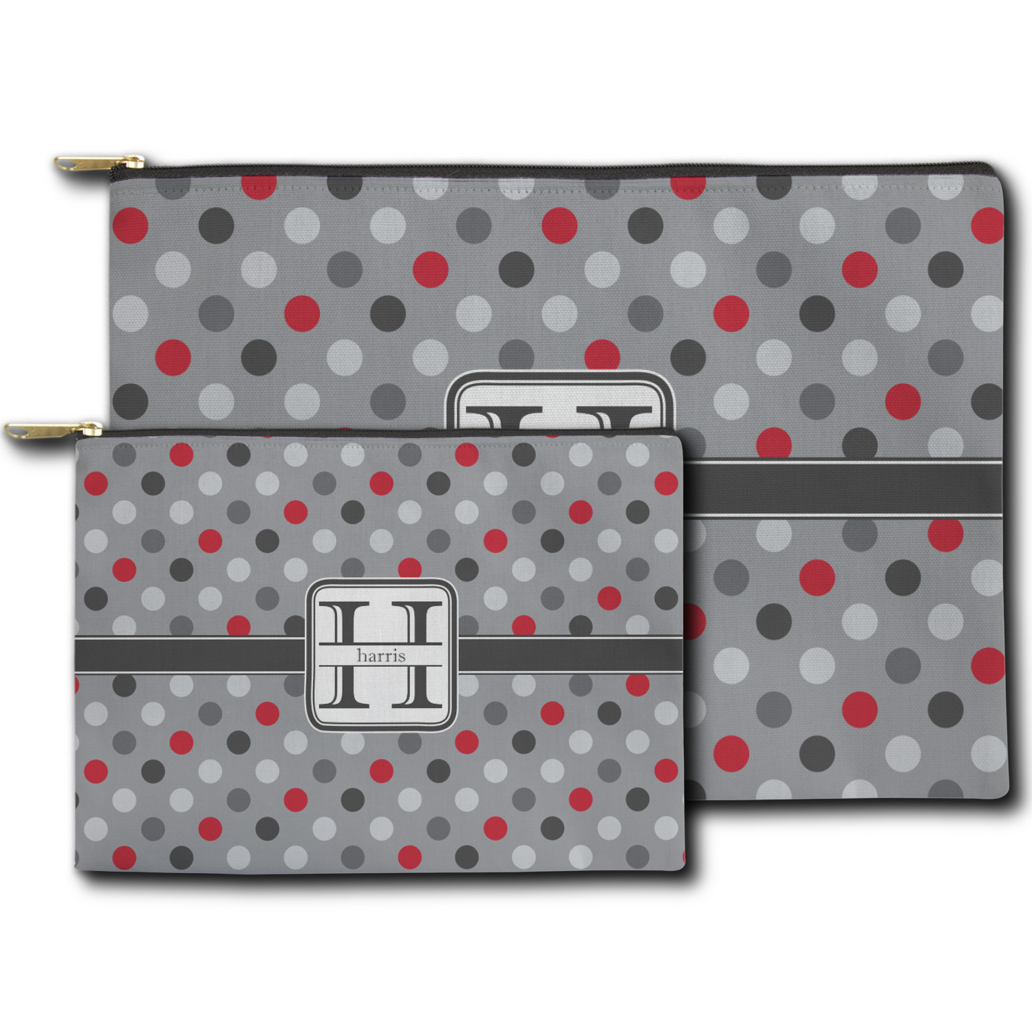 Our zippered pouches are available in two sizes - small: approx 8.5W"x6H and large: approx 12.5Wx8.5H. The pouches are made from a soft & durable canvas fabric that is printed on the outside with your design; the inside has a fused black lining. The printed canvas fabric is then cut and the pouches are sewn right here in the USA. The zipper itself is gold in color and has a round hook.