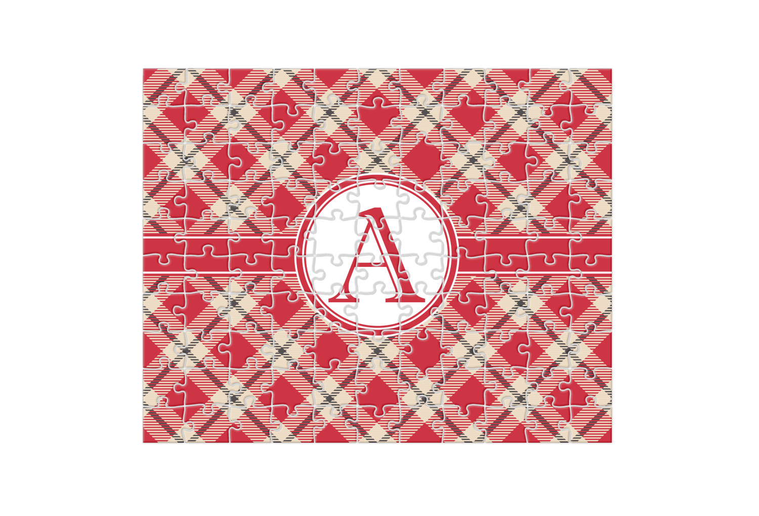 For our design, we chose a simple plaid; we chose red & tan to create a unisex palette and used dark grey for our accent color. We also chose the classic ribbon and round label with an elegant initial for our very simple, yet elegant personalization.
