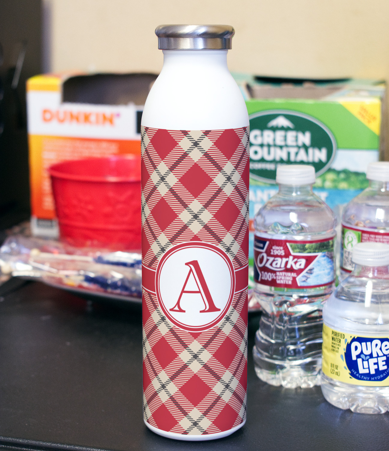 For our design, we chose a simple plaid; we chose red & tan to create a unisex palette and used dark grey for our accent color. We also chose the classic ribbon and round label with an elegant initial for our very simple, yet elegant personalization.