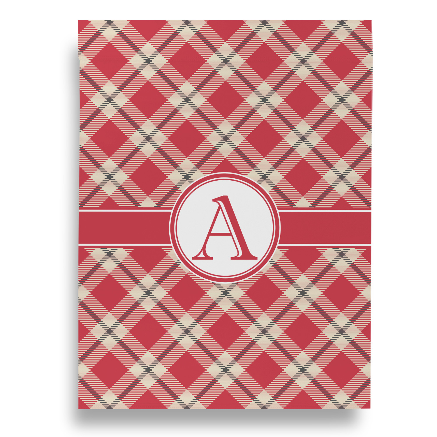 For our design, we chose a simple plaid; we chose red & tan to create a unisex palette and used dark grey for our accent color. We also chose the classic ribbon and round label with an elegant initial for our very simple, yet elegant personalization.